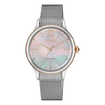 The Citizen EM0816-88Y is a true embodiment of elegance and sophistication. This Eco-Drive women's watch features a captivating mother-of-pearl dial that shimmers with a pearlescent glow, adding a touch of enchantment to your wrist.Â