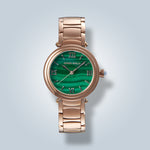The Eterna Gem draws its essence from malachite, a stone known for its flowing green bands that symbolize renewal, balance, and timeless strength. Each dial tells a story of the earth’s artistry, blending natural beauty with refined craftsmanship to create a piece as unique as its wearer. It is a celebration of elegance that is rooted in nature yet destined for eternity.