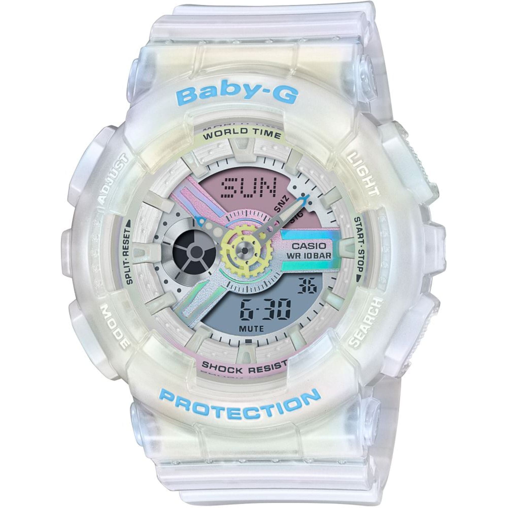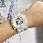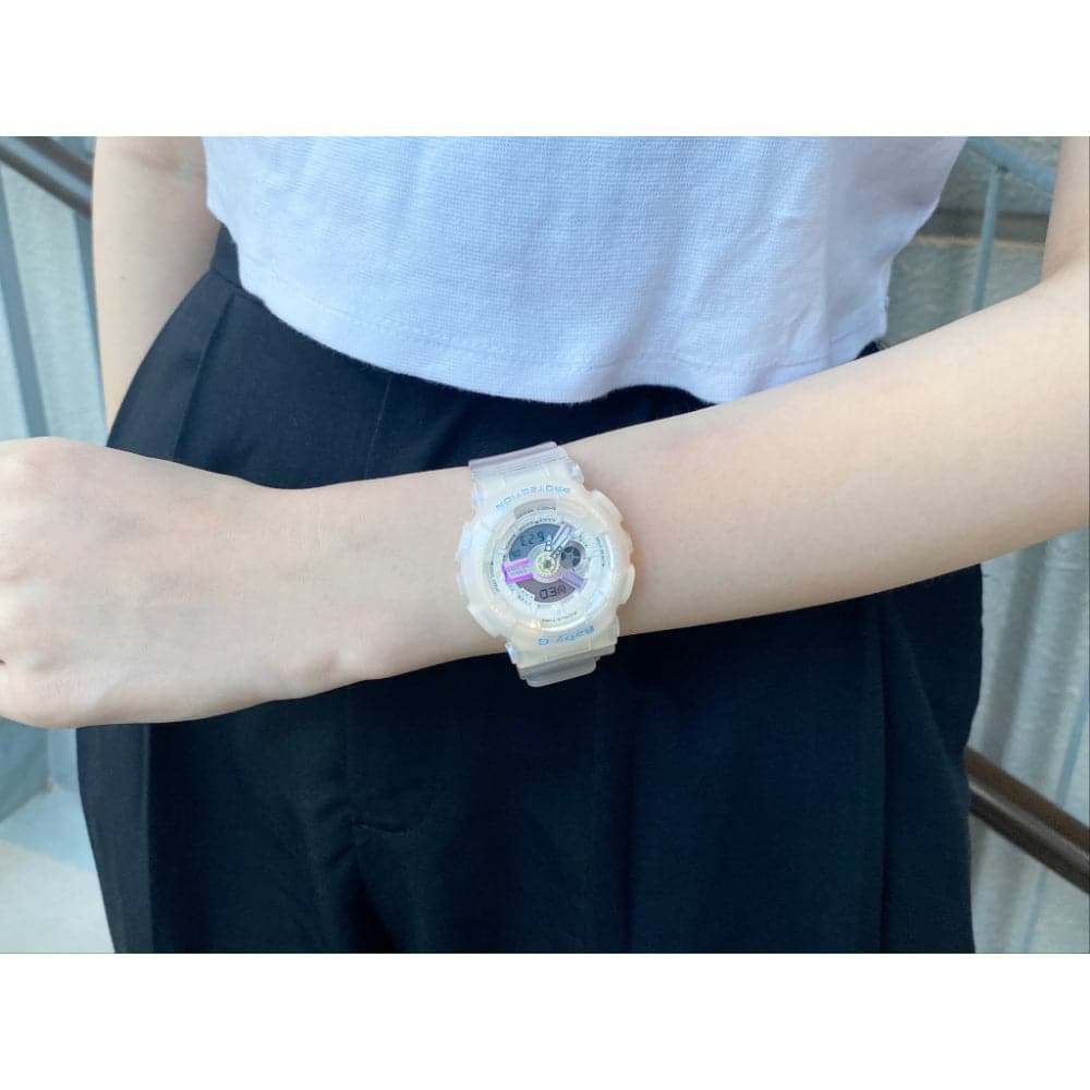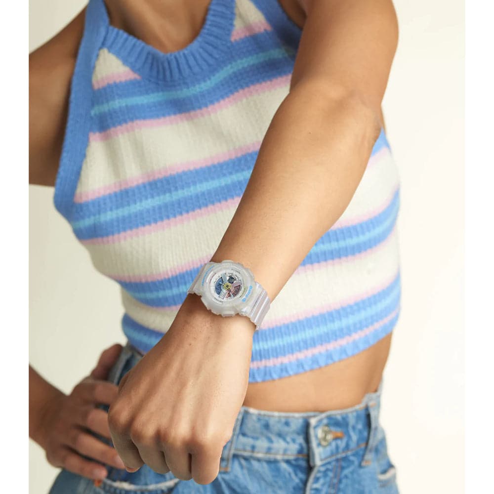 From BABY-G, the casual watch for active women, come new models decorated with sea glass colors. Sea glass is natural frosted glass found on beaches along bodies of salt water, which takes decades to acquire its characteristic texture and shape. The blue, pink, and white matte semi-transparent material used for the cases and bands of these models creates a sea glass like look. Glittering gold metal parts on the faces create the image of light reflecting from sea glass for designs that are perfectly suited for summertime beach wear.