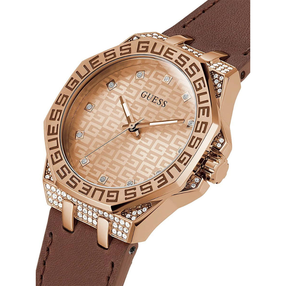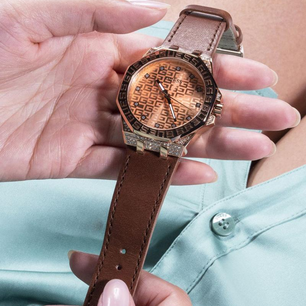 Guess GW0547L2 women's watch from the Insignia collection presents a brave design and classic colors. A design connecting a leather strap in a brown shade with a pink envelope and a shield of the same color is a proposal for ladies feeling well in current trends. The fashionable style is emphasized by the brand name appearing on the bezel. The ears of the housing and dials brighten the shimmering crystals.