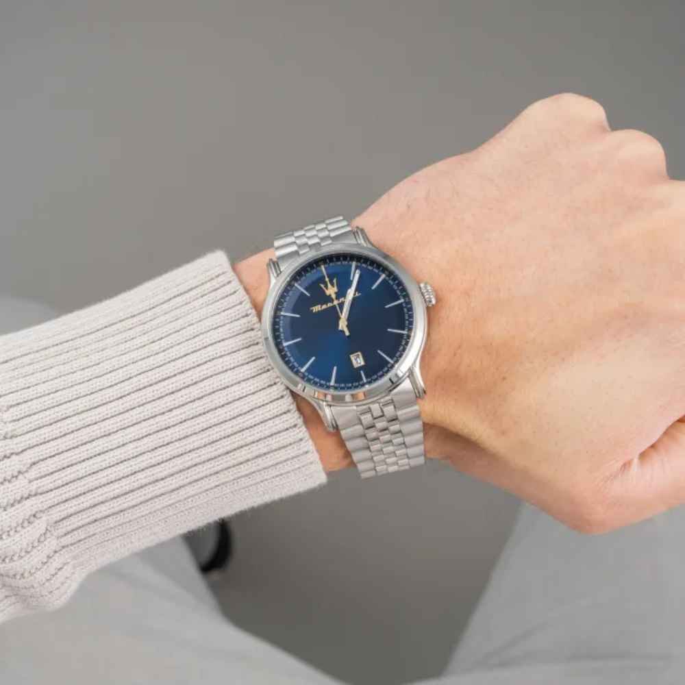 Maserati watch from the Época collection, the brand's most classic line. It has a silver-colored steel case with a stainless steel bracelet. This model combines the gold-colored indexes and hands with a blue dial.