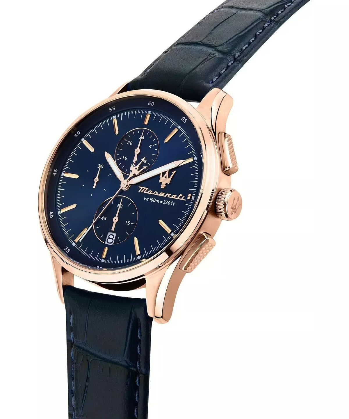 Maserati Sorpasso R8871624009 is a men's chronograph watch that offers not only elegance, but also functionality. A rose gold case with a blue leather strap gives it a sophisticated look. The watch features a chronograph, a sub-dial with 24-hour time and is water resistant to 100 meters, ideal for men who appreciate an active lifestyle.