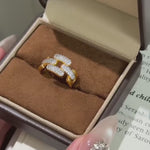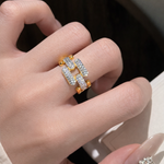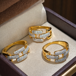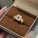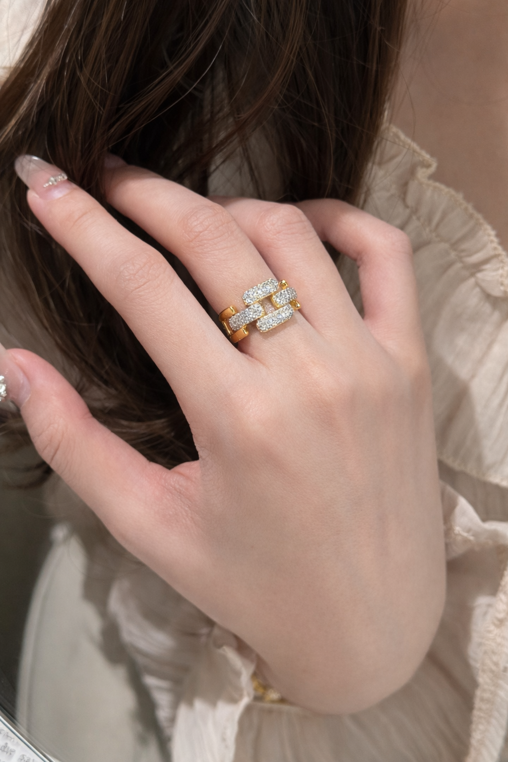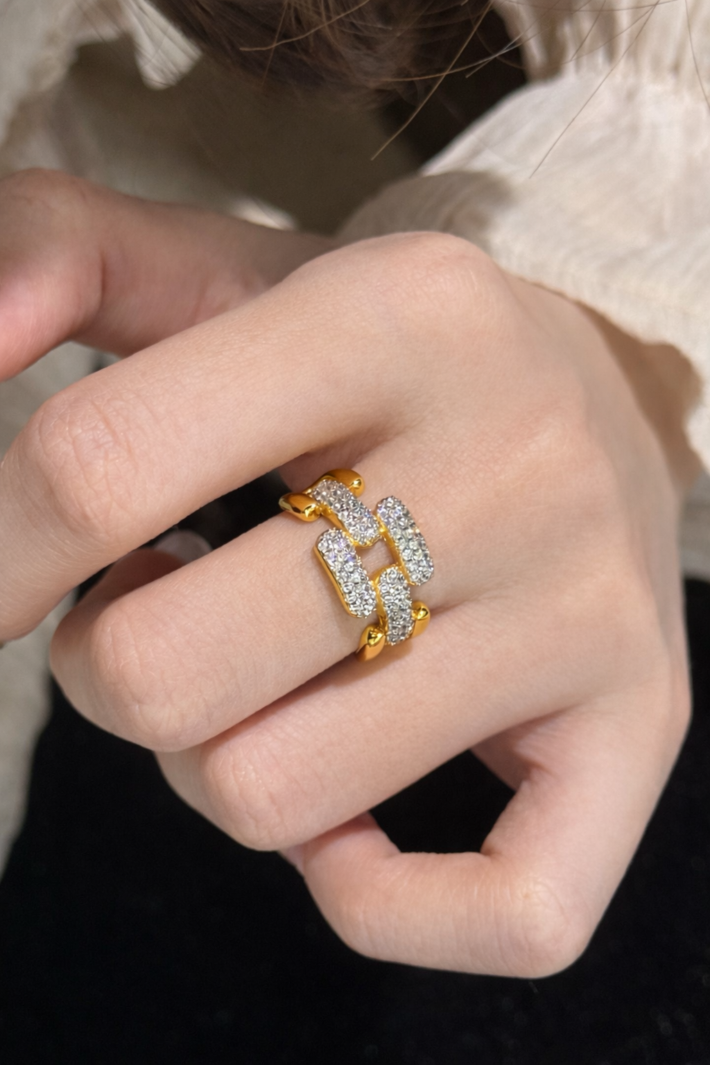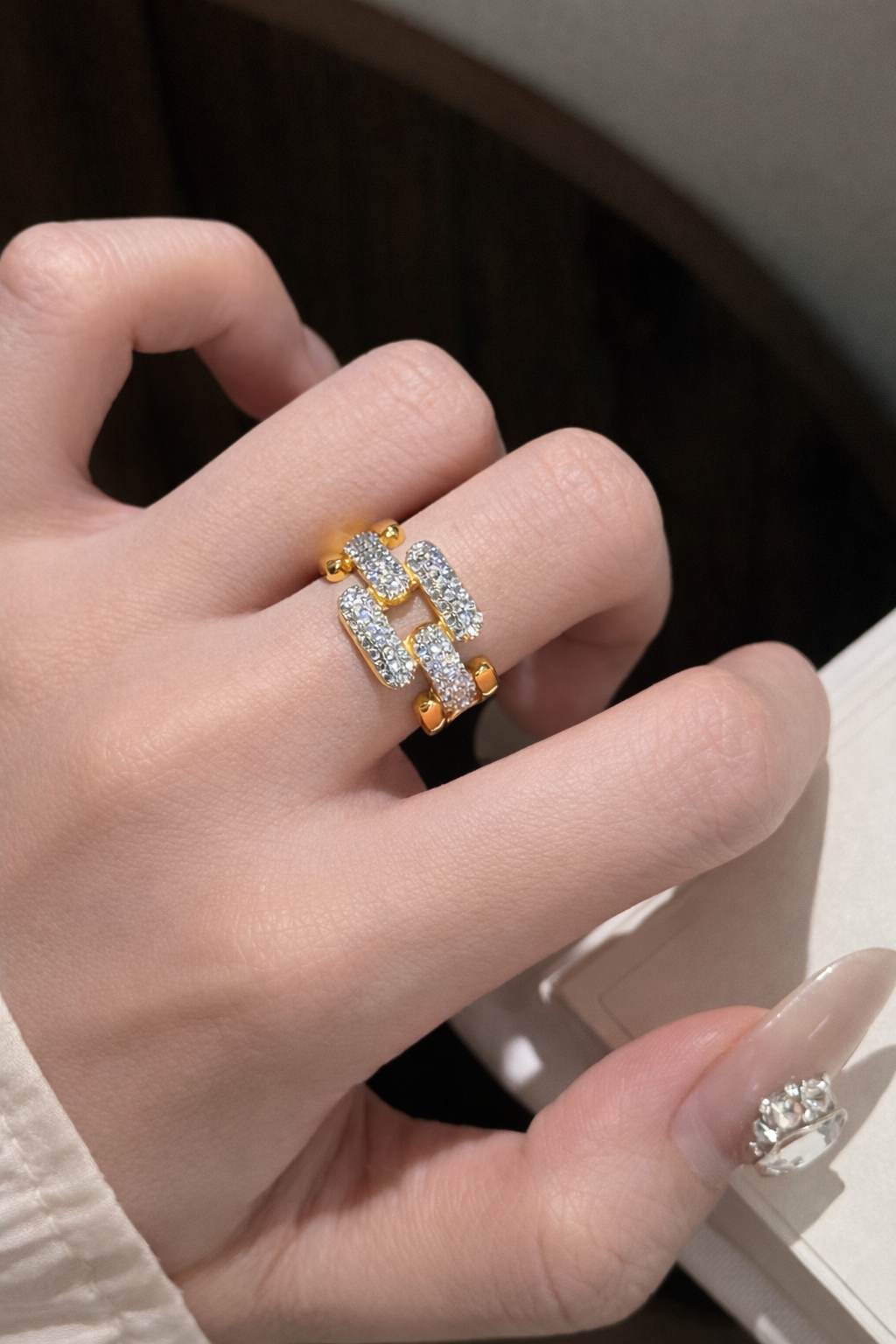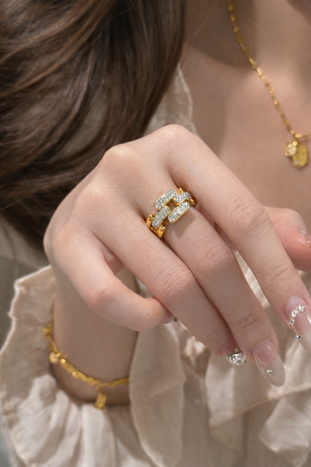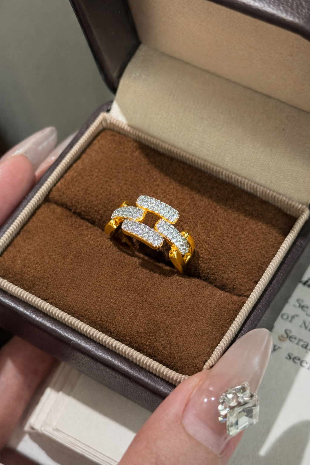 The Aurora Link Ring is designed for those who command attention without asking for it. Featuring bold, interlocking gold links accented with pavé brilliance, this piece embodies strength refined by elegance — a modern statement of confidence and prestige.
