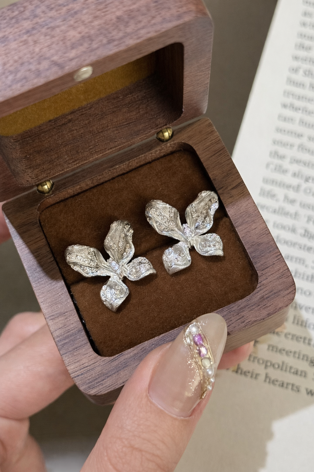 The Butterfly Bloom Stud Earrings capture the delicate elegance of a butterfly in full flight, sculpted with softly curved wings and adorned with shimmering crystal accents. A symbol of renewal, freedom, and feminine strength, this design brings poetic beauty into a refined, wearable form.