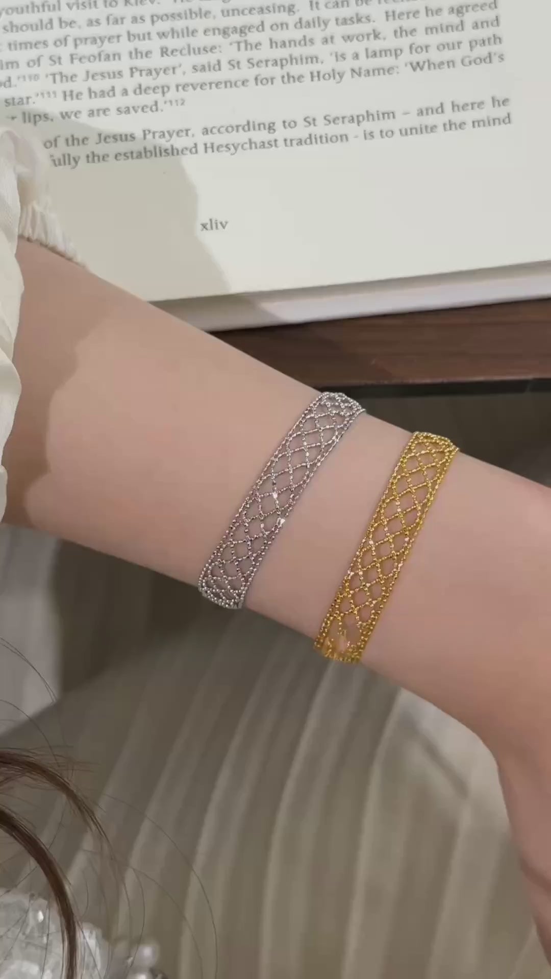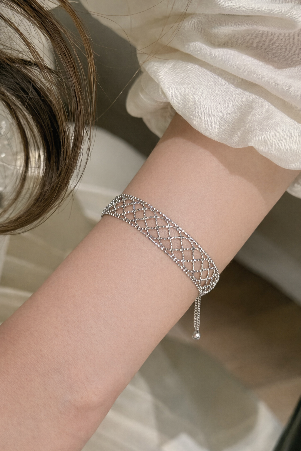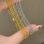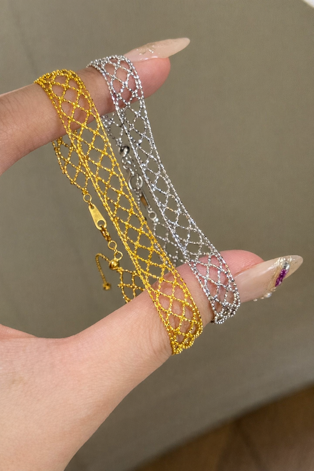 The Ethereal Mesh Bracelet features a finely interlaced openwork design that drapes softly around the wrist, creating a light, lace-like silhouette with luminous depth. Each delicate link forms a graceful lattice, reflecting light with subtle shimmer and fluid movement.