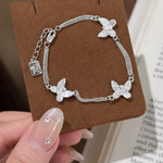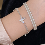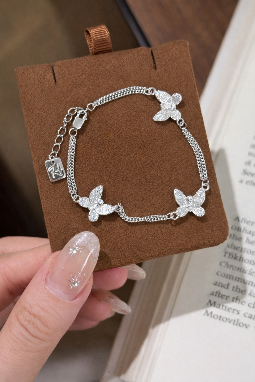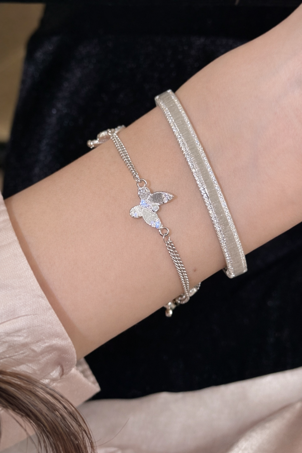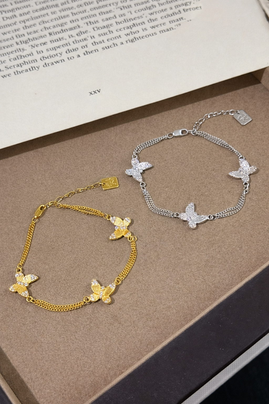 The Flutter Luxe Bracelet features a refined double-chain design adorned with sculptural butterfly motifs, delicately accented with pavé crystals for luminous sparkle. Each butterfly symbolizes transformation, freedom, and feminine strength, making this piece both meaningful and effortlessly elegant.