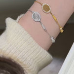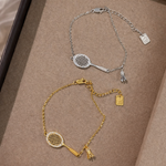 The Grand Slam Charm Bracelet features a sculptural tennis racket centerpiece framed with pavé crystals, symbolizing confidence, ambition, and winning spirit. Accented with a delicate tassel charm and refined chain detailing, this piece blends sporty inspiration with modern luxury.