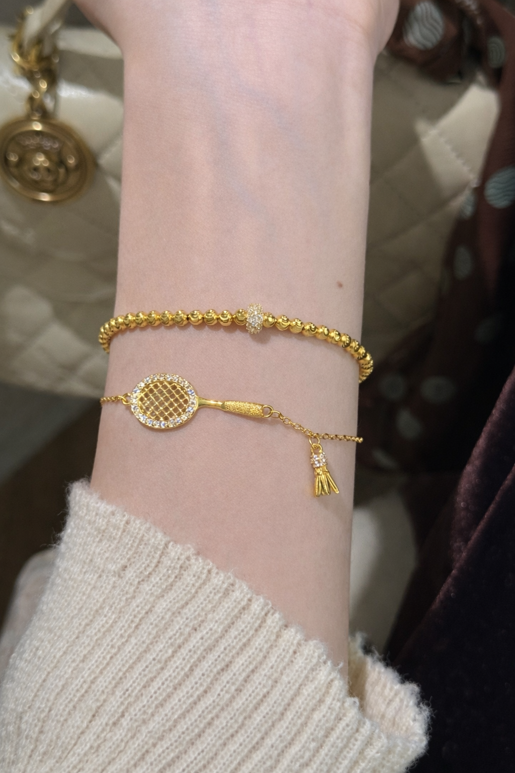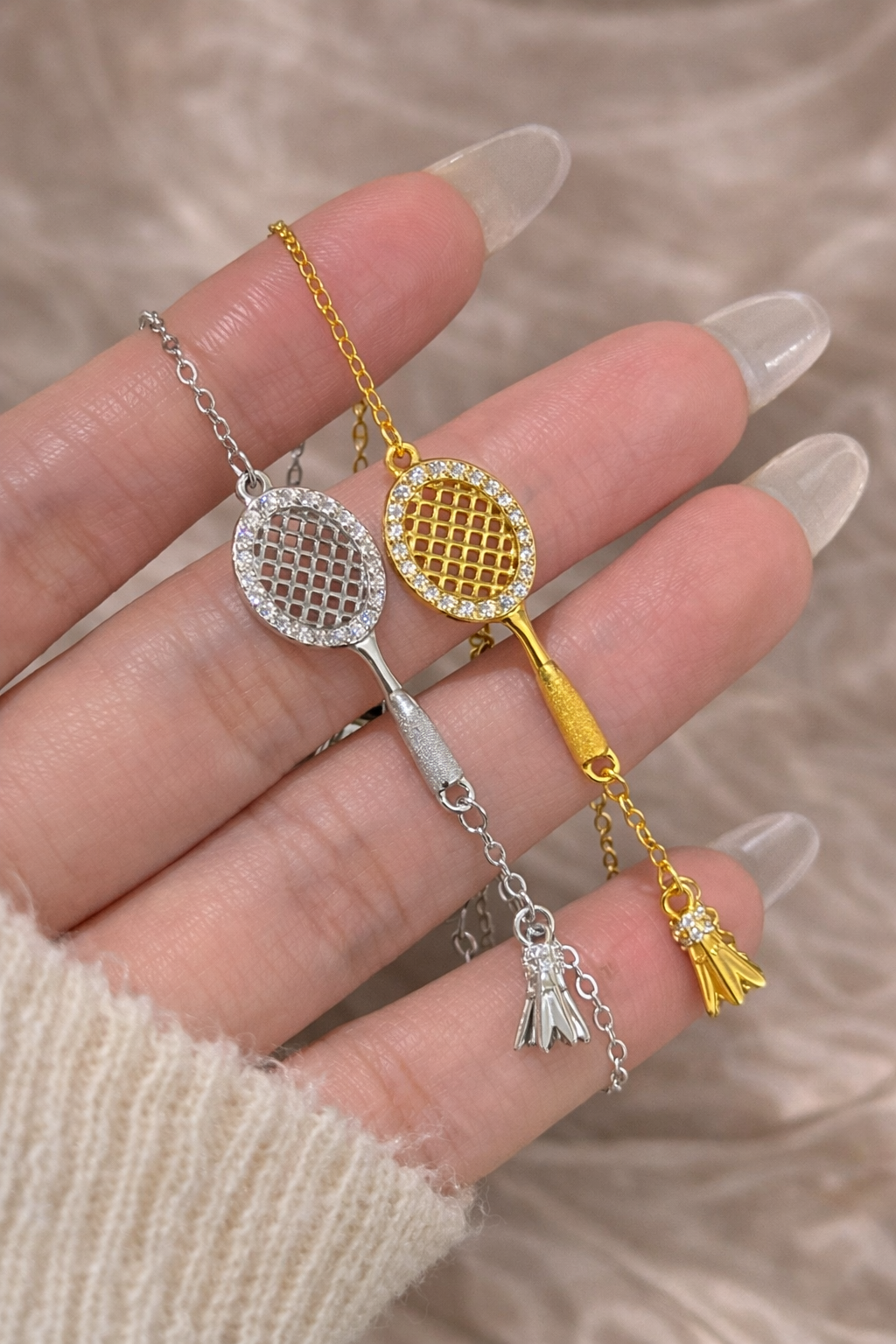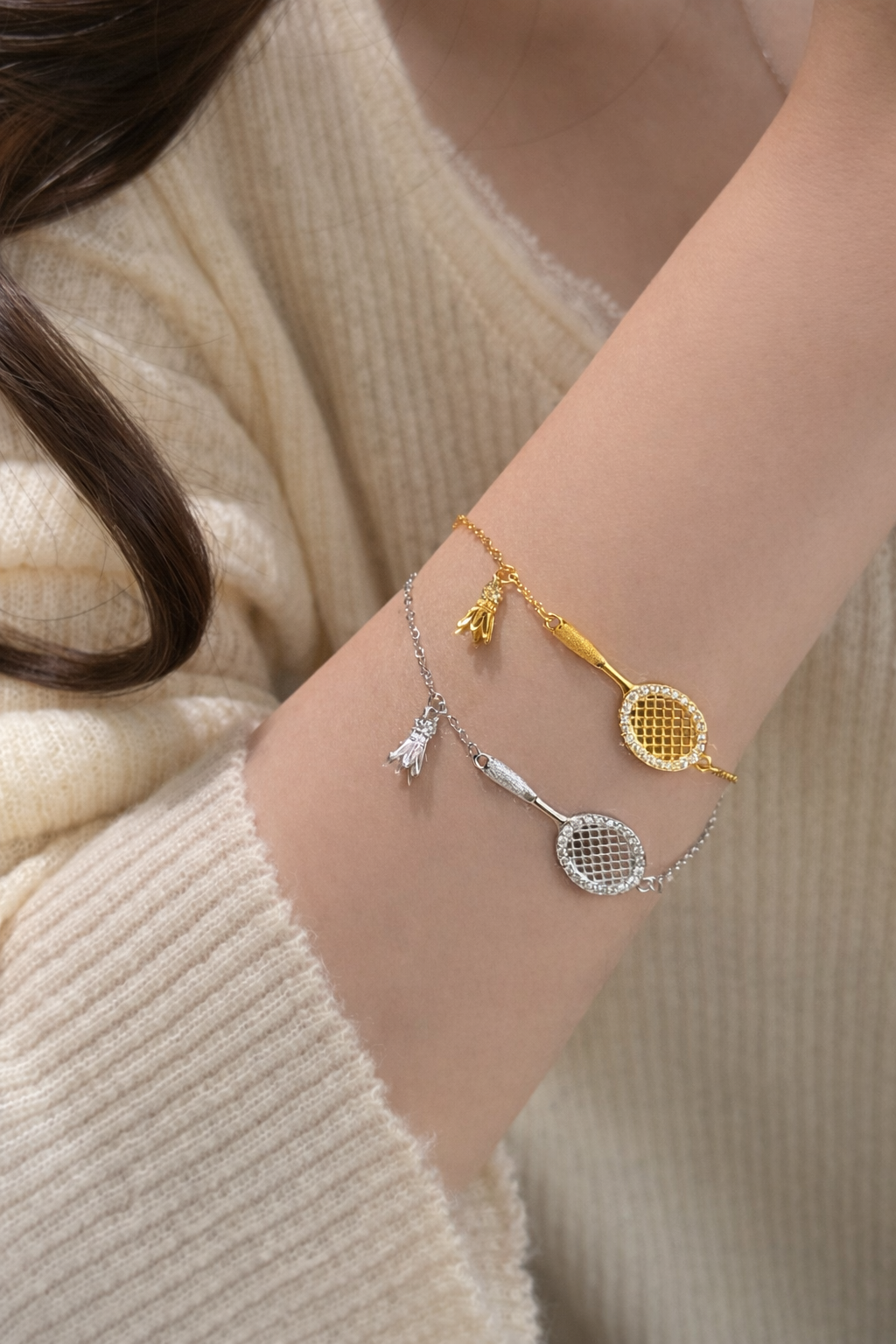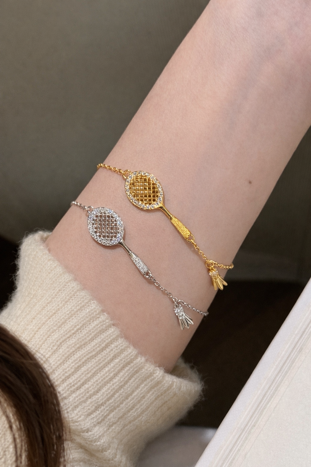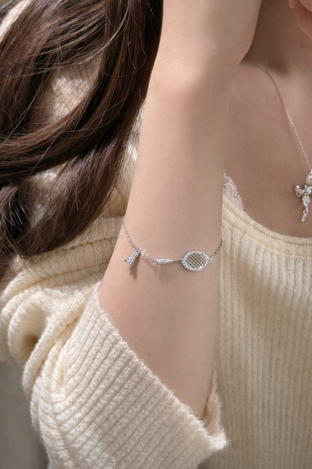 Designed to feel light yet expressive, the bracelet drapes gracefully around the wrist, offering subtle movement and layered charm. The crystal-framed racket adds a luminous focal point, making it both a statement piece and a meaningful symbol of drive and success.