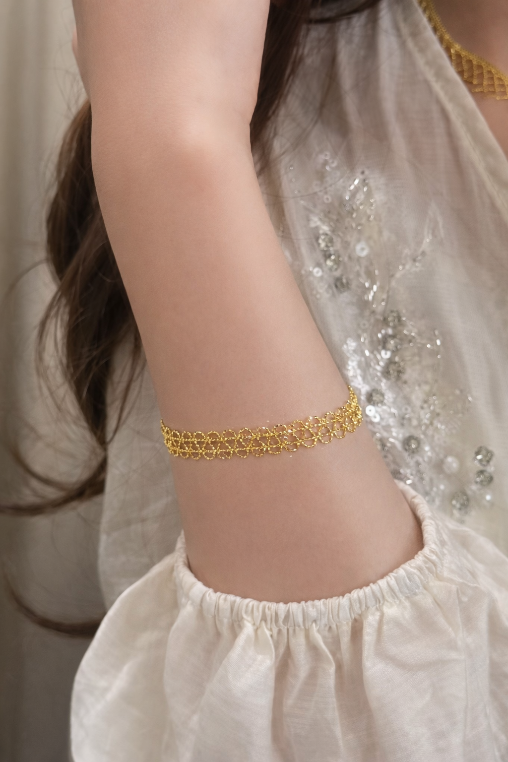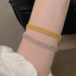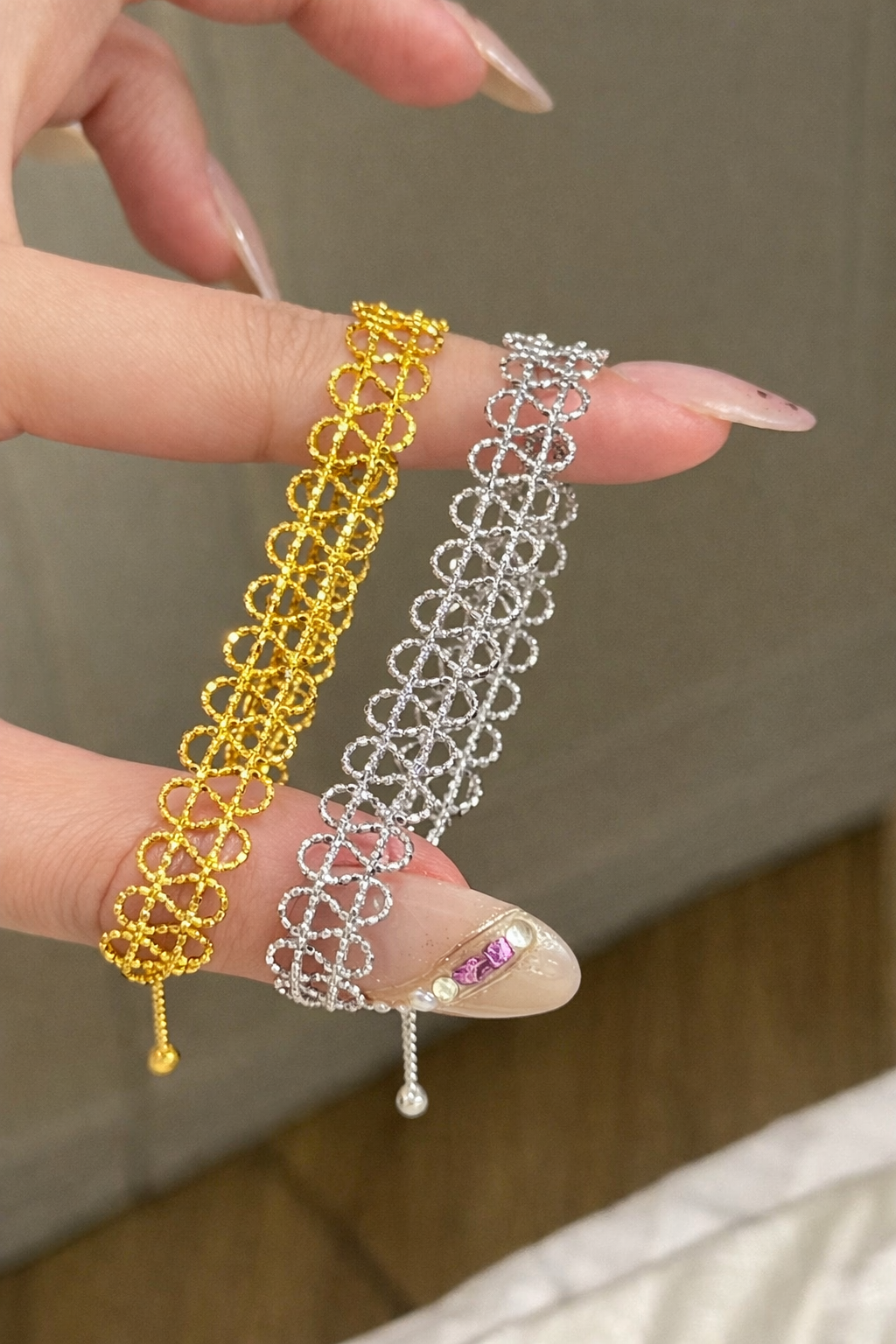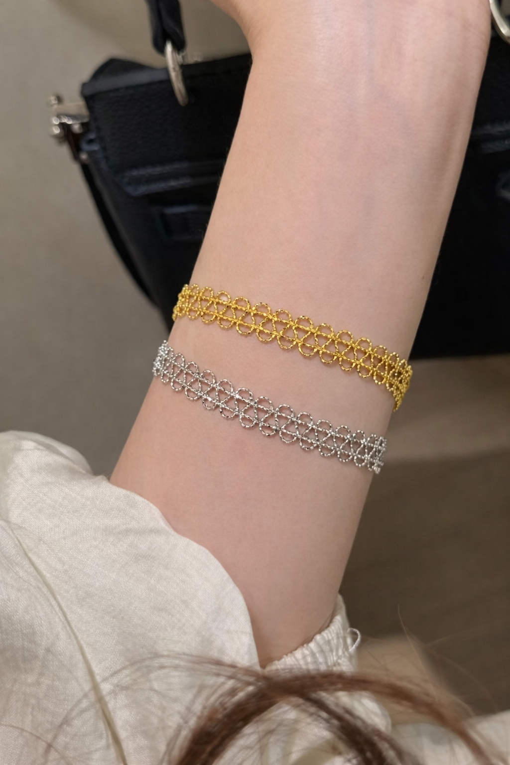 Available in radiant gold and sleek silver, the Infinity Lace Bracelet is a refined statement for those who love elegant details with modern charm.