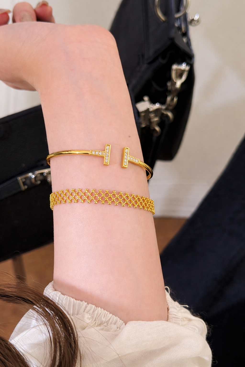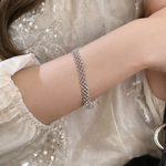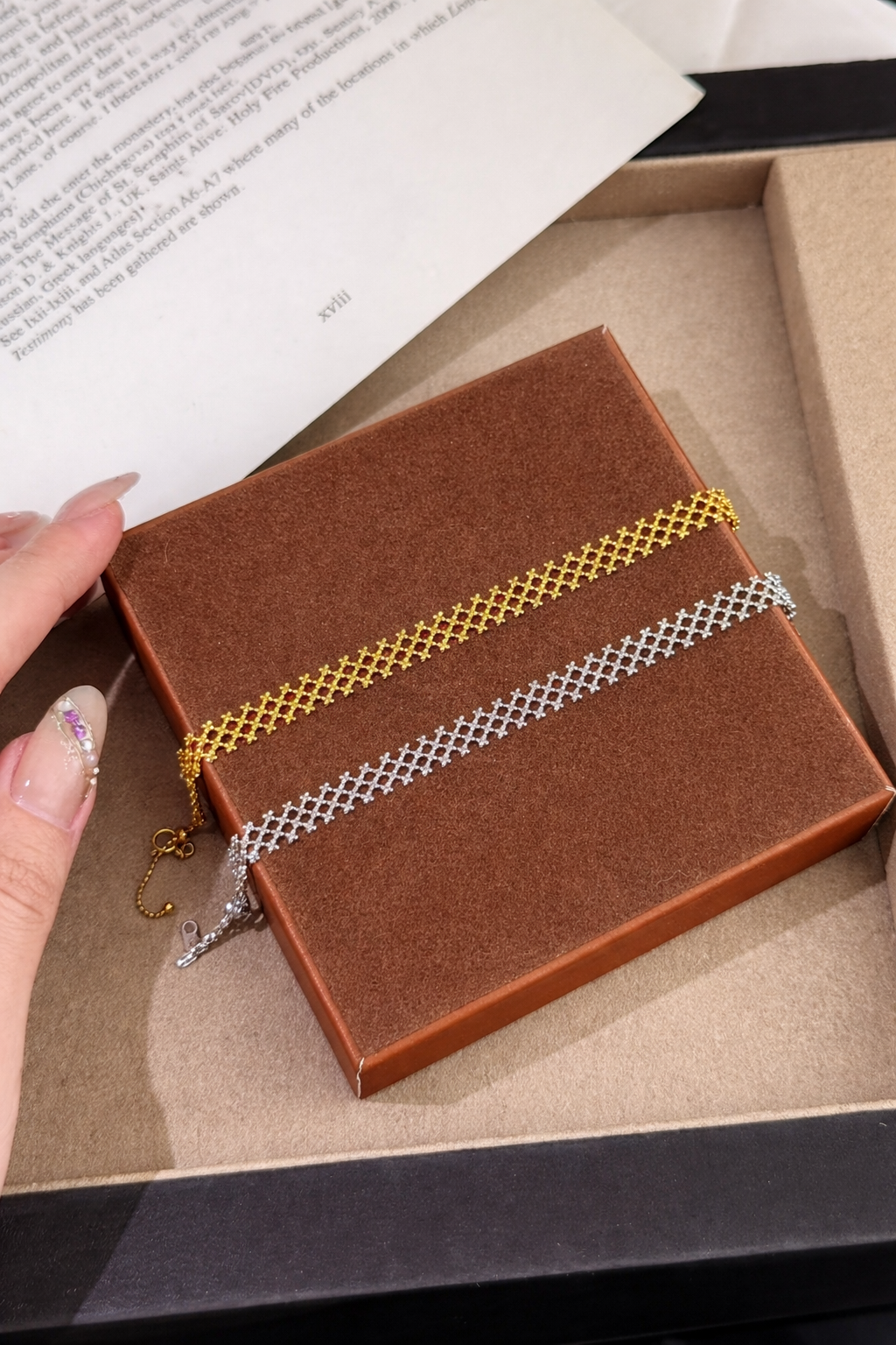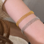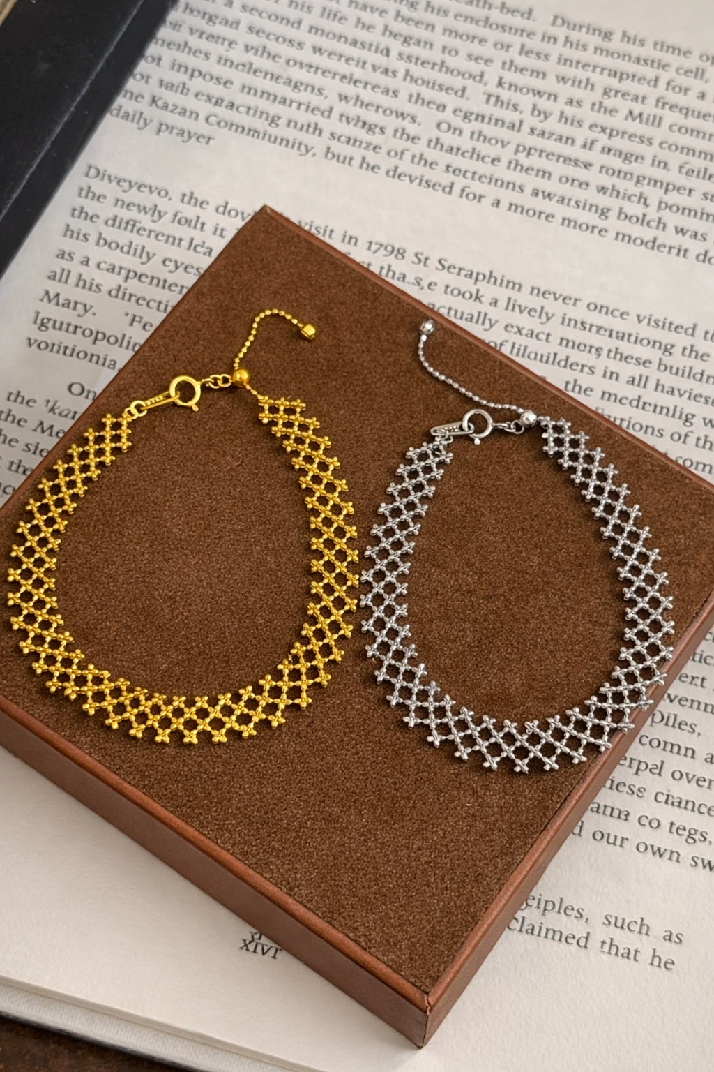 The Lattice Luxe Bracelet features a finely woven openwork design, forming a graceful geometric lattice that wraps softly around the wrist. Each interlinked segment reflects light with subtle shimmer, creating a refined texture that feels both delicate and striking.