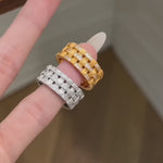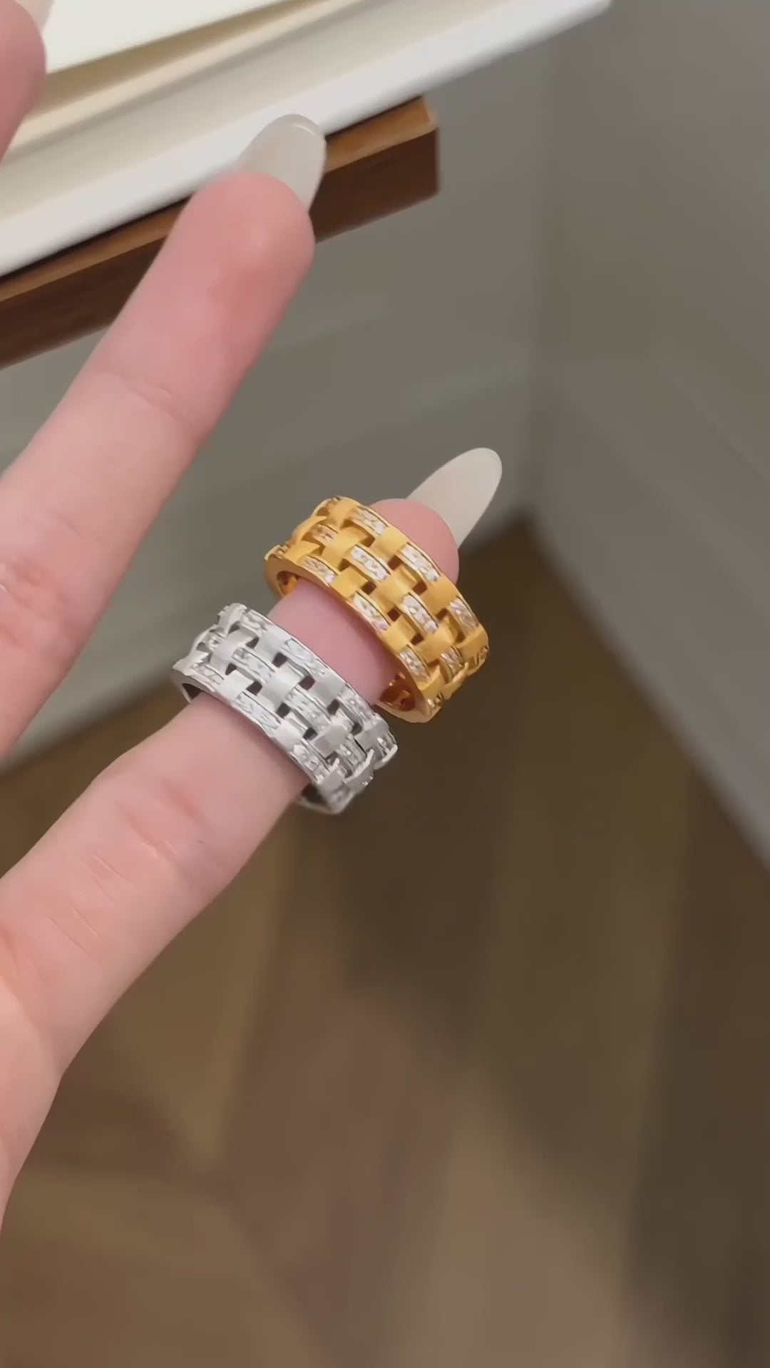 Each band is meticulously crafted to create a dimensional weave. Solid yet fluid. Bold yet refined. The brushed texture softens the shine, allowing the crystals to glow with understated confidence rather than excess brilliance.