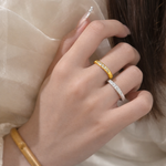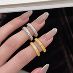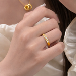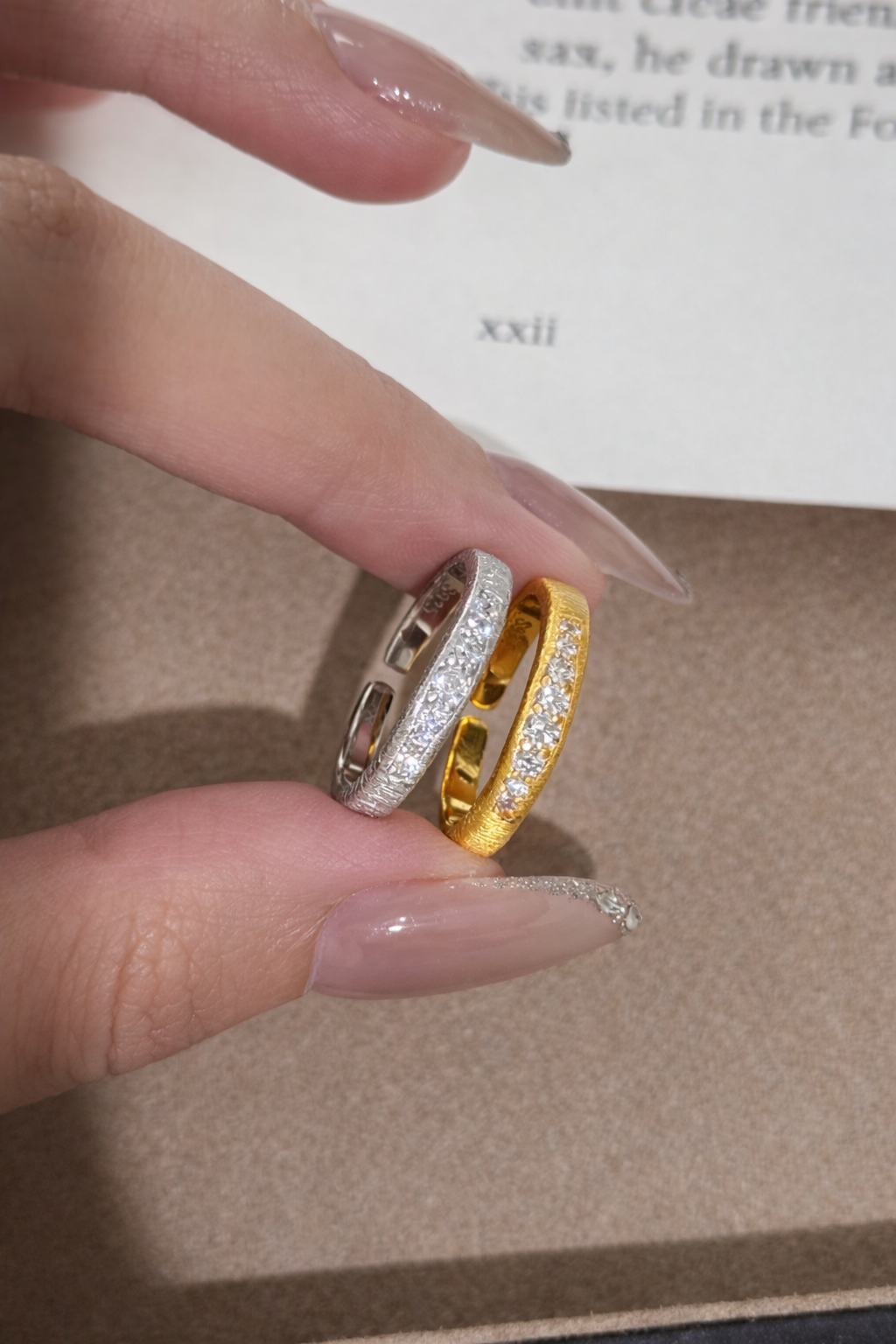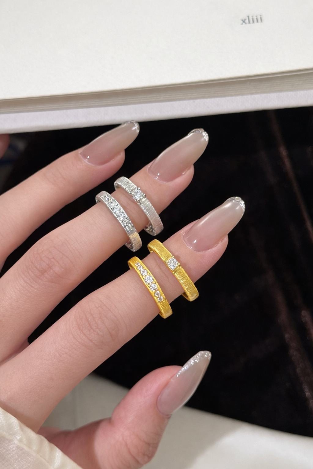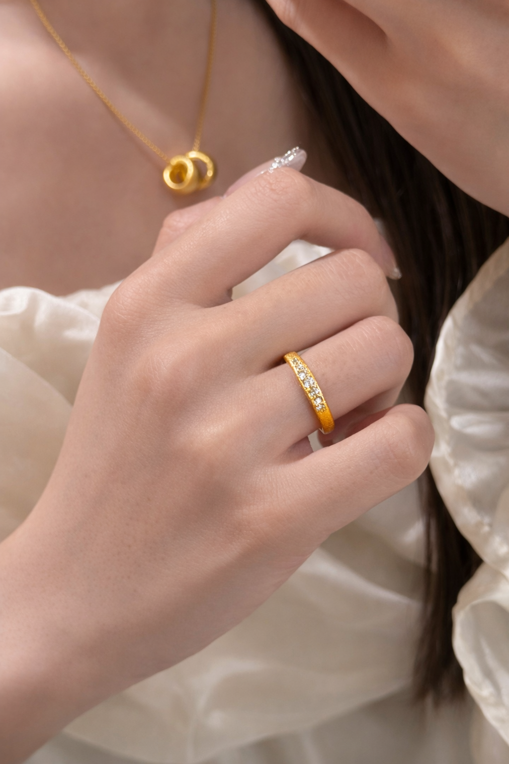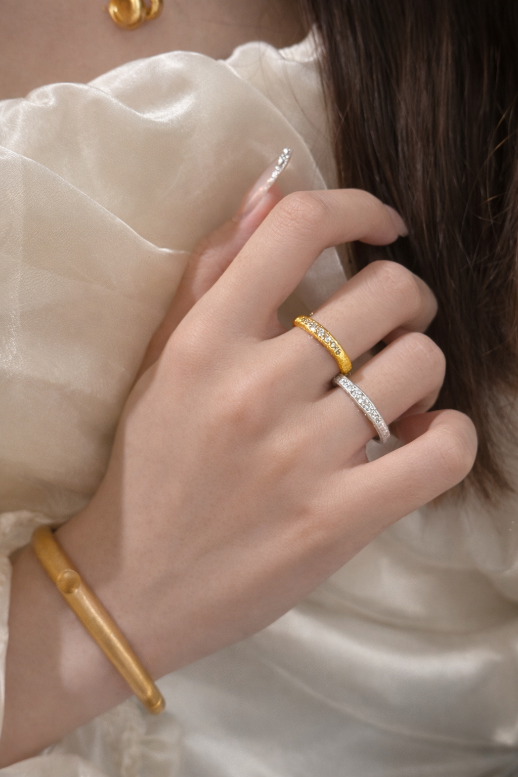 The Lumière Eternity Band is crafted for those who understand that true elegance lives in restraint. A seamless row of brilliant crystals flows across a softly brushed band, catching light with every movement while maintaining a refined, modern silhouette.