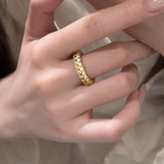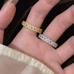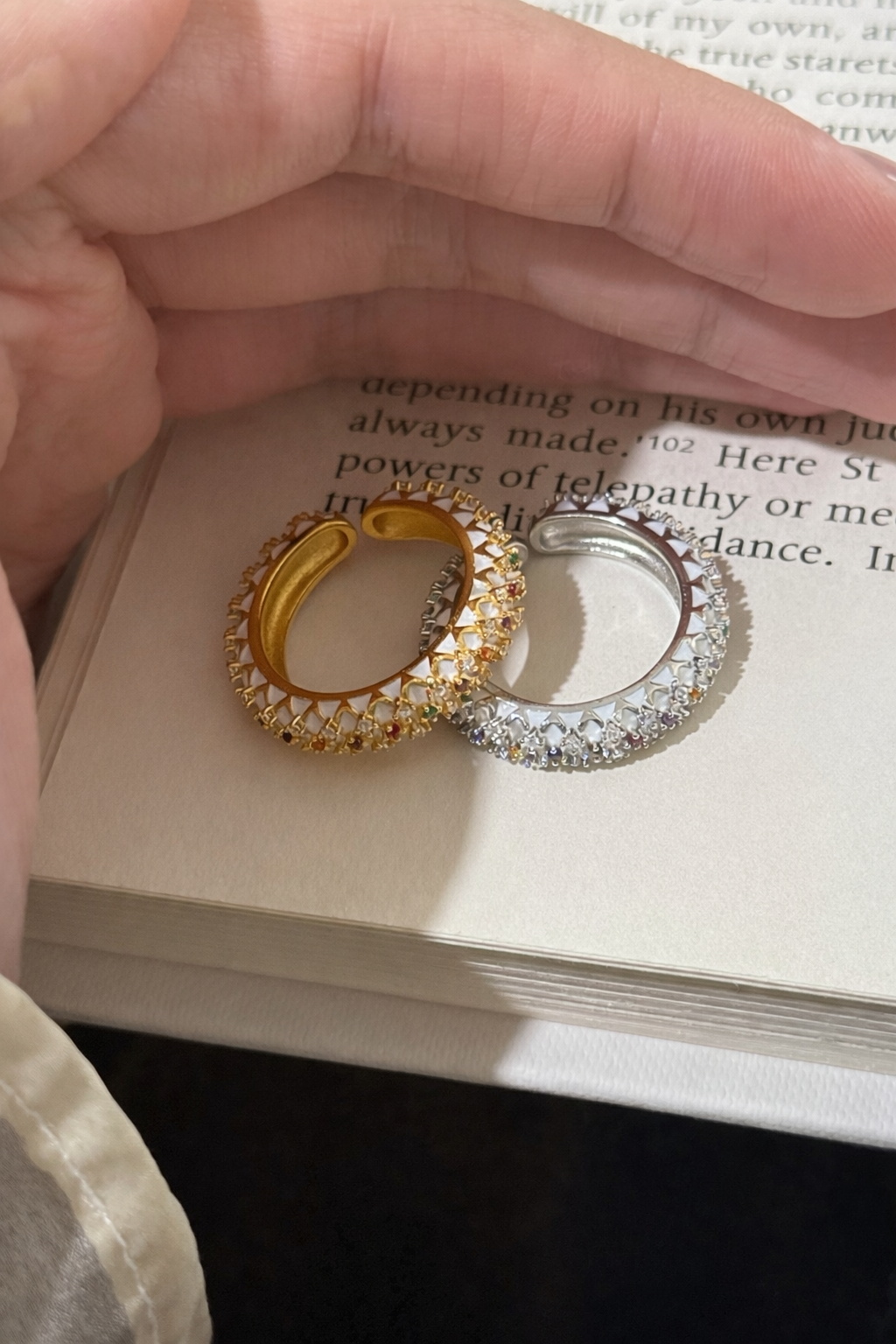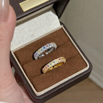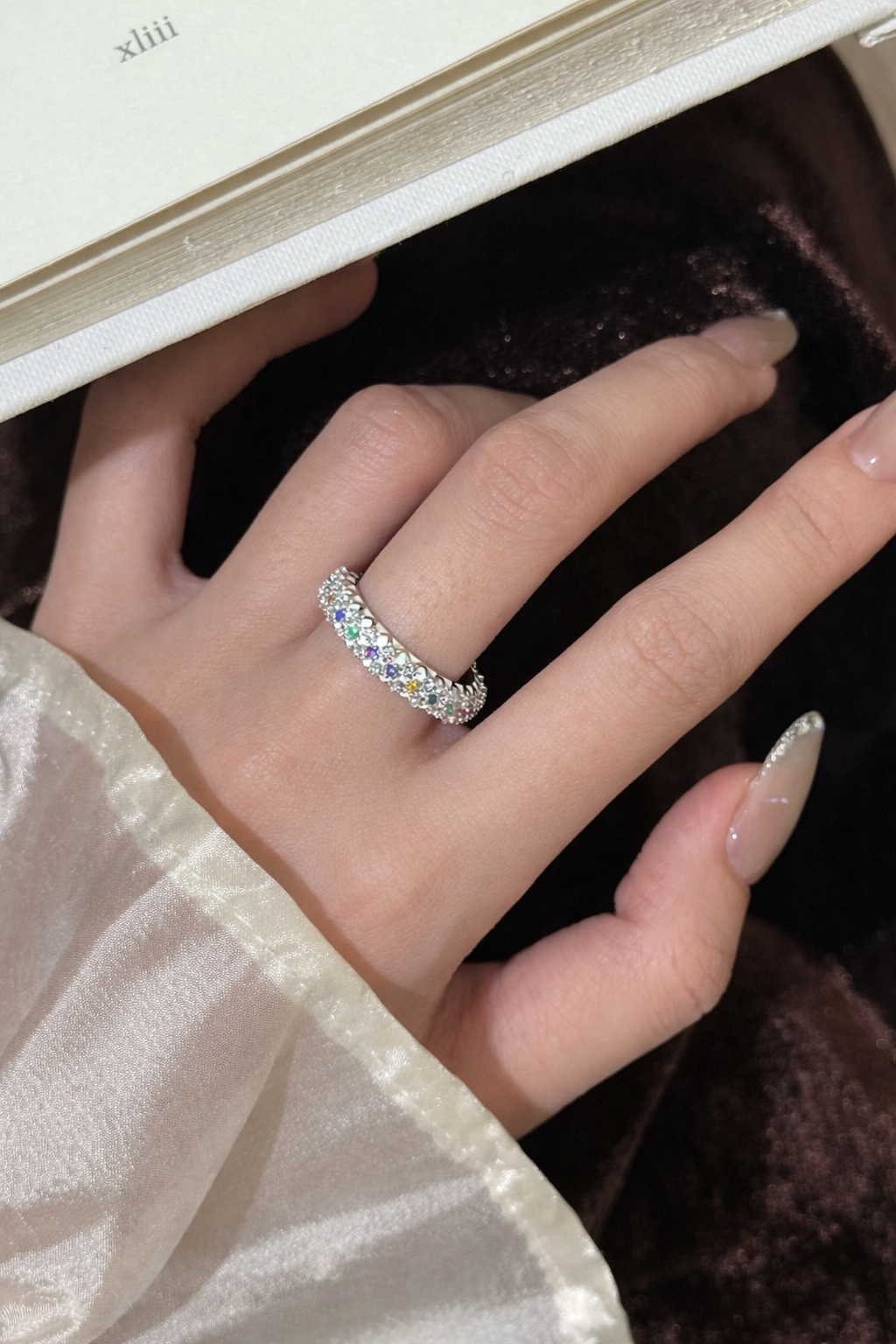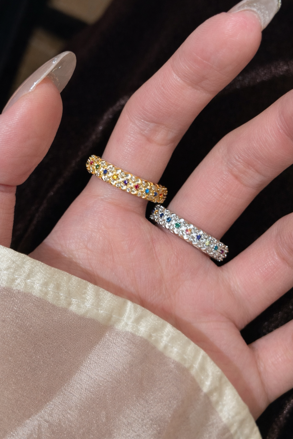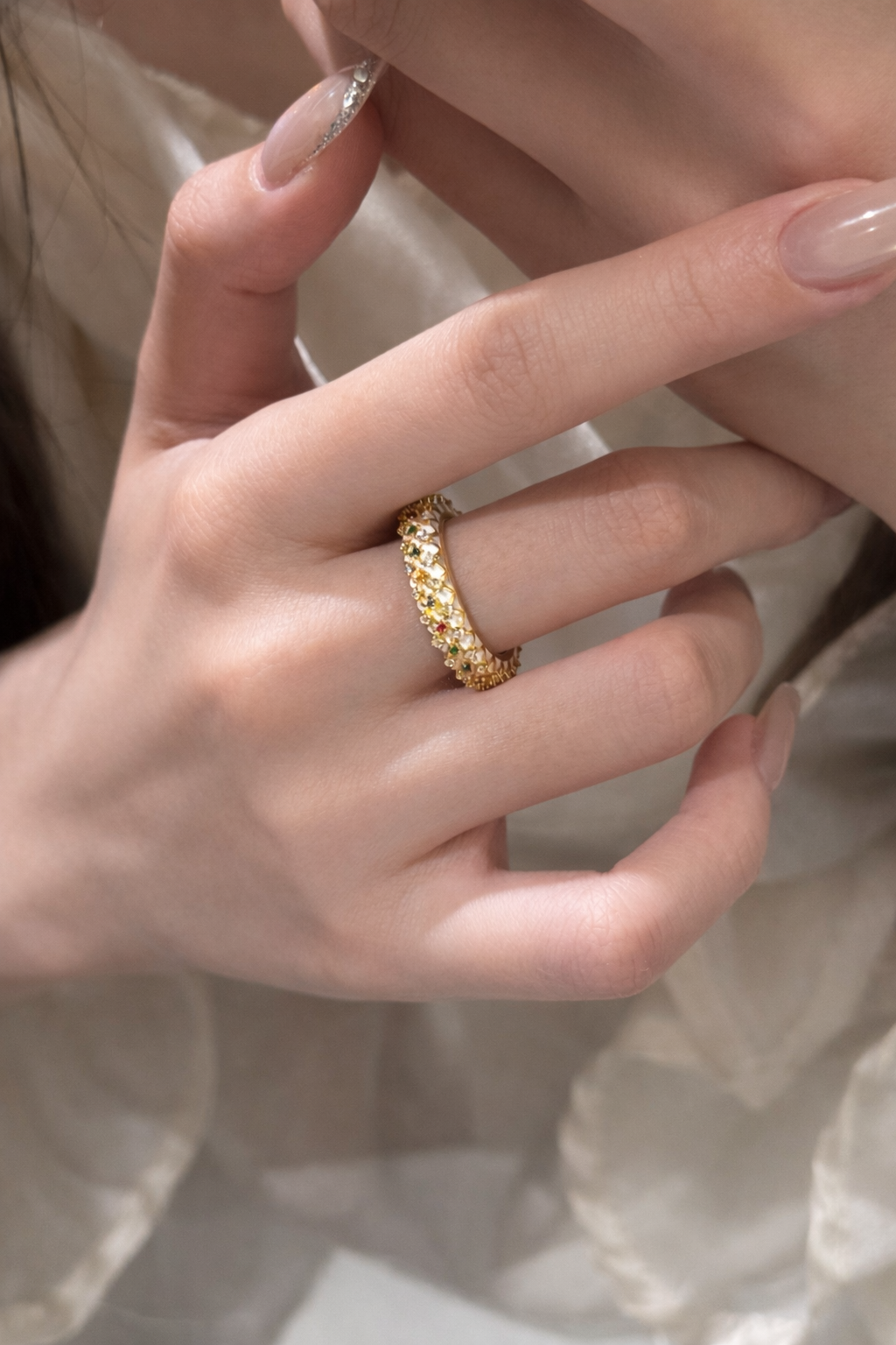 The ring features a full eternity setting of delicately sized, multi-coloured crystals, each representing a different emotion, opportunity, or chapter in life. Together, they form a seamless spectrum — no beginning, no end.