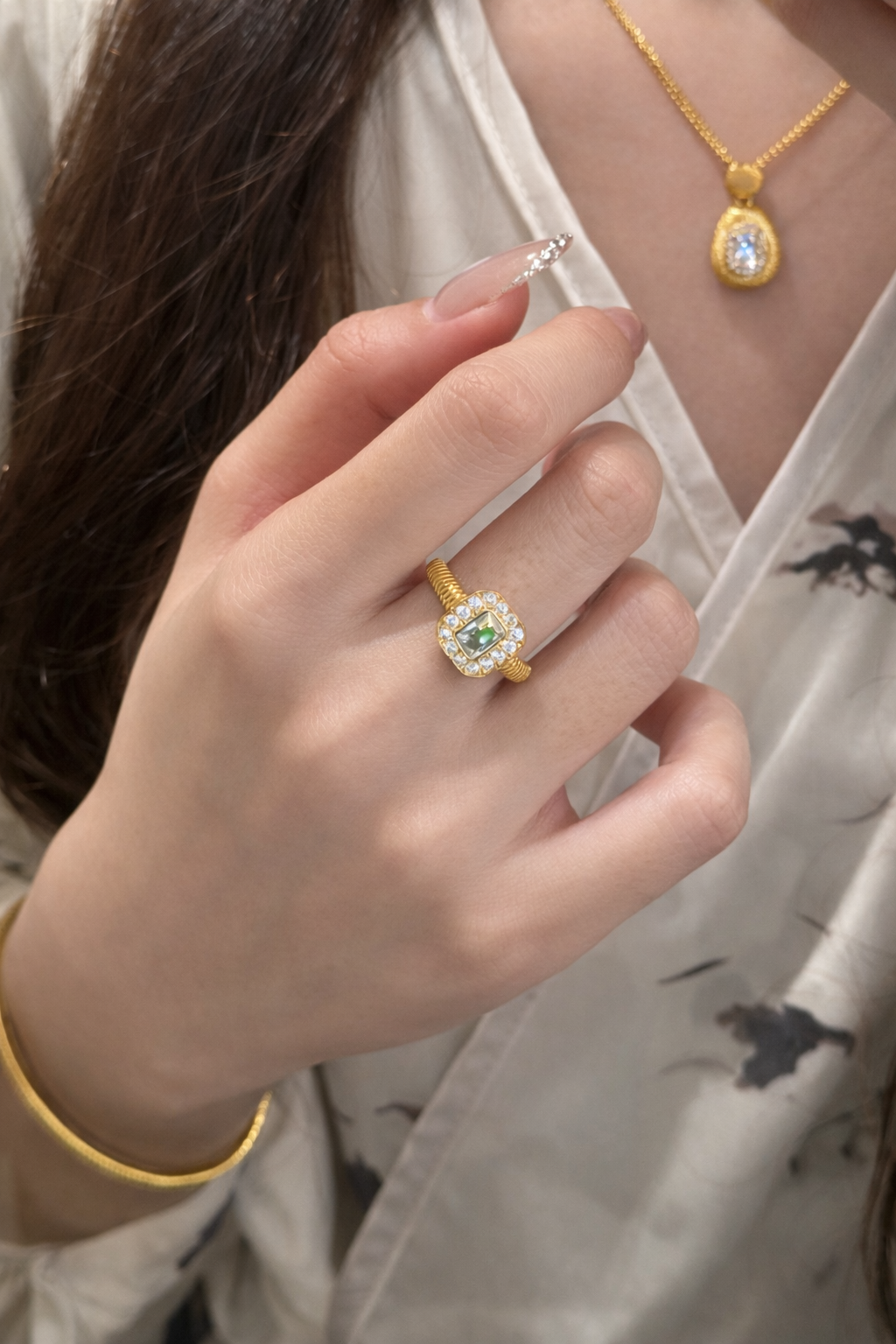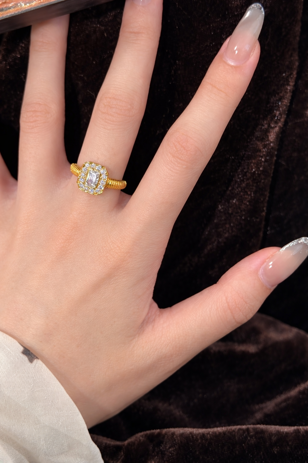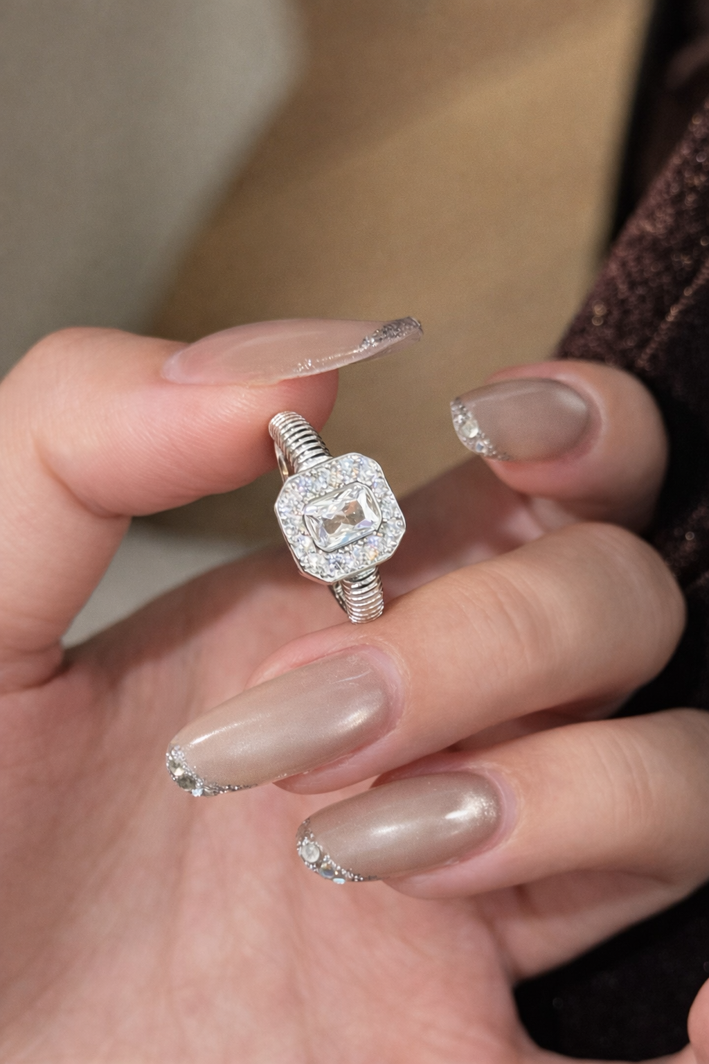 The rectangular centre stone symbolizes focus, direction, and decisiveness. Encased within a luminous crystal frame, it reflects clarity of mind and composed confidence. The ribbed band adds subtle texture, grounding the brilliance with structure and stability.