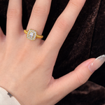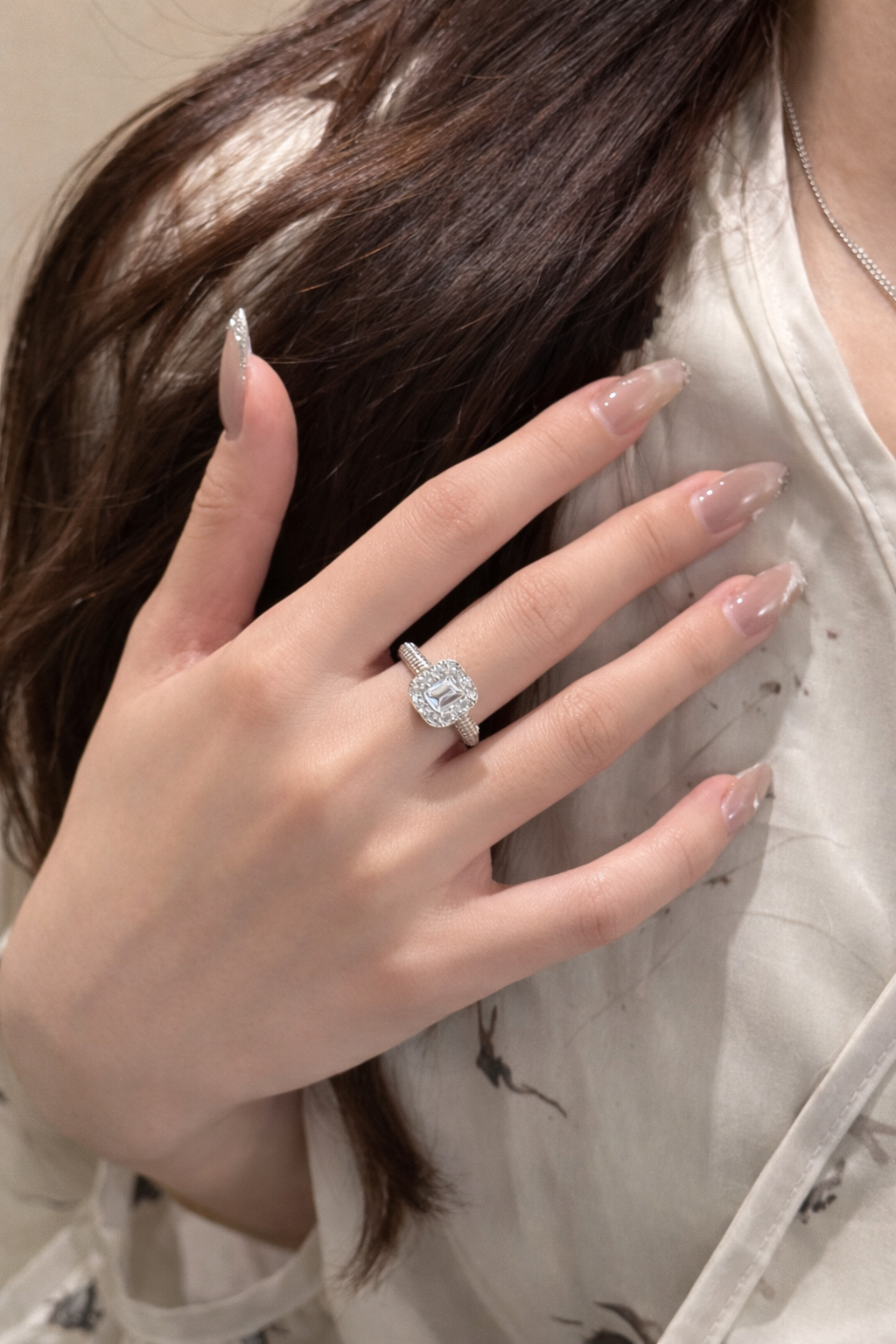 The Radiant Frame Ring is designed for those who appreciate strength expressed through clarity. Featuring a rectangular-cut Centre stone framed by a halo of precision-set crystals, this ring balances architectural form with refined sparkle.