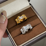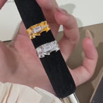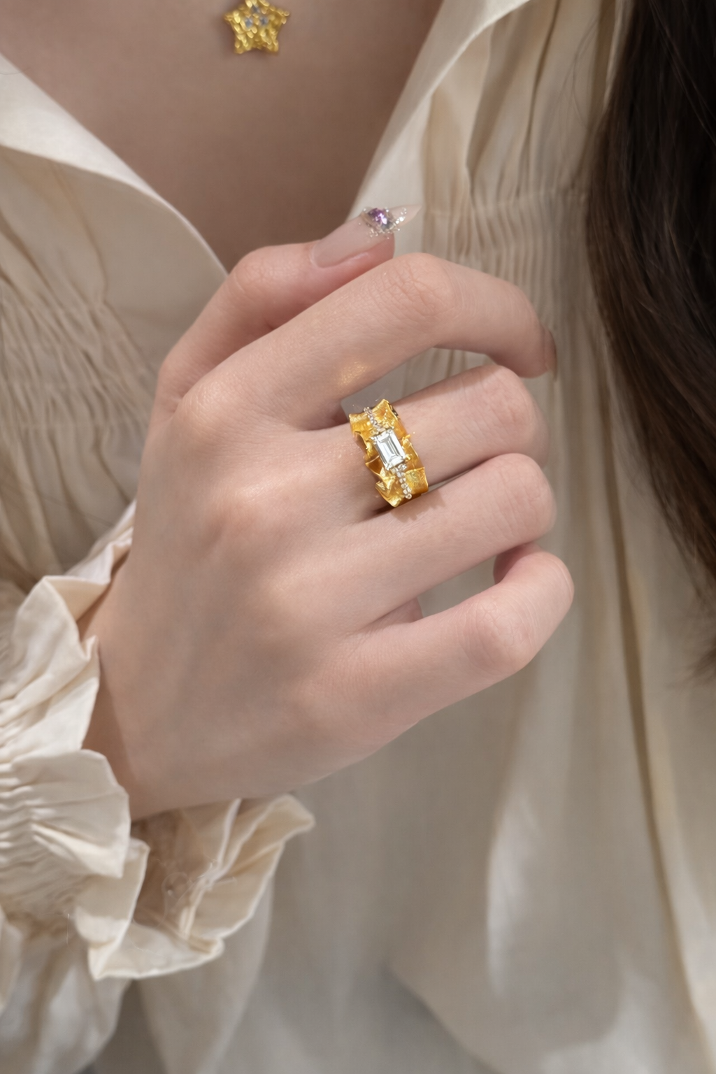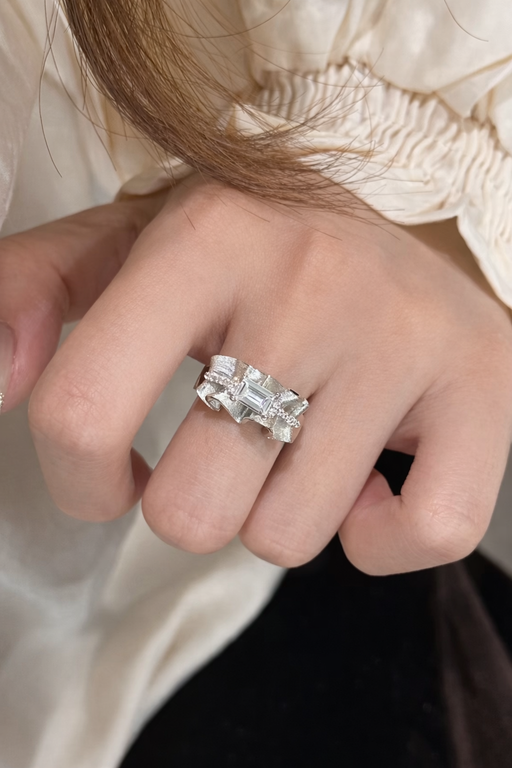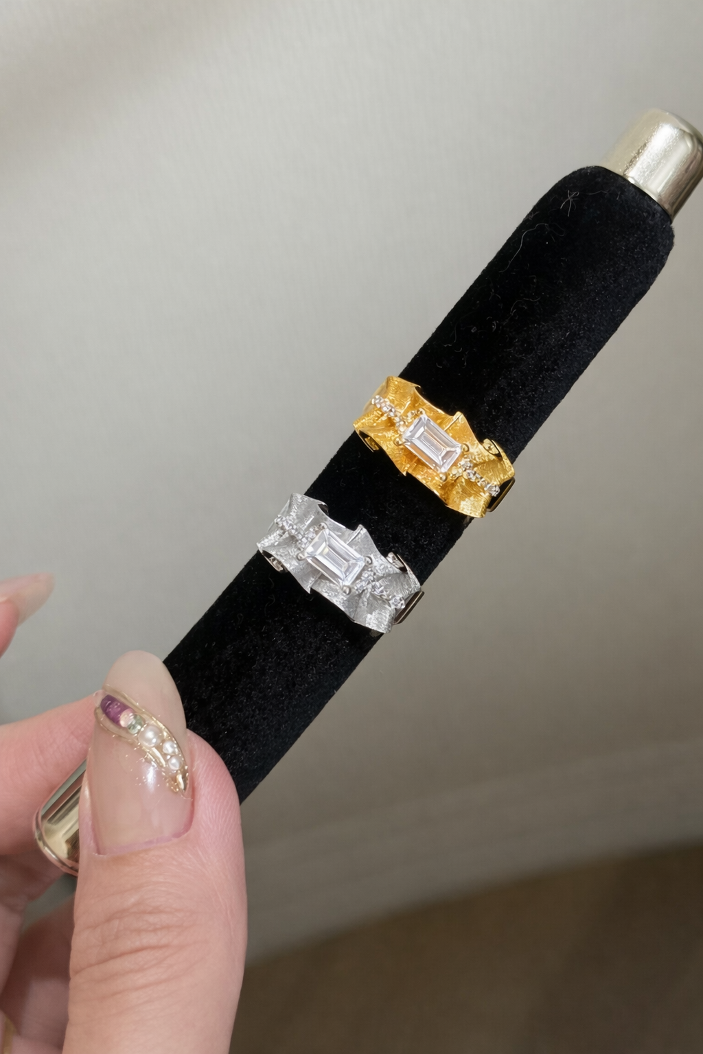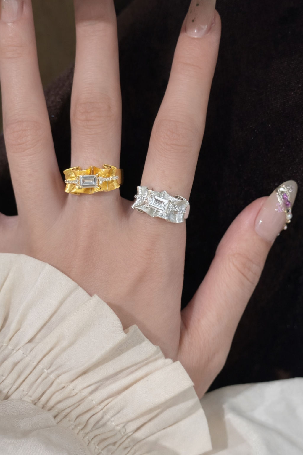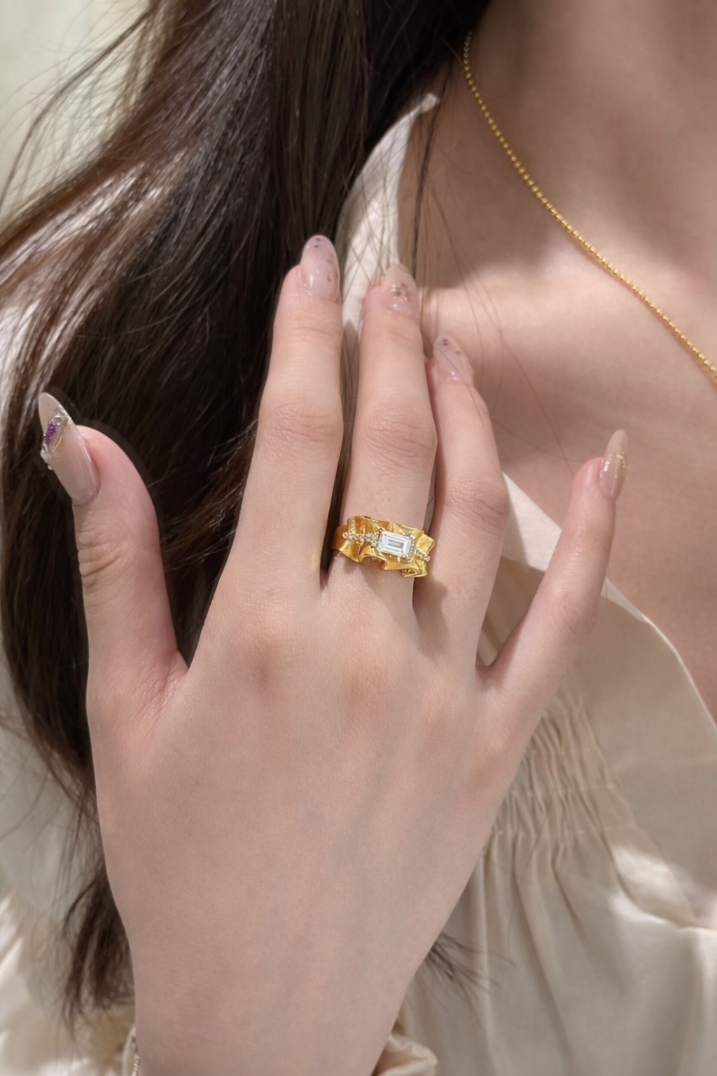 The Regal Crest Ring is designed with sculpted contours that rise and fall like folded silk, framing a bold emerald-cut centerpiece. It blends strength and elegance in equal measure, creating a statement that feels intentional, confident, and unmistakably modern.