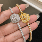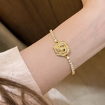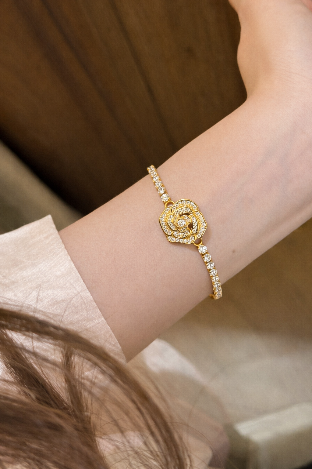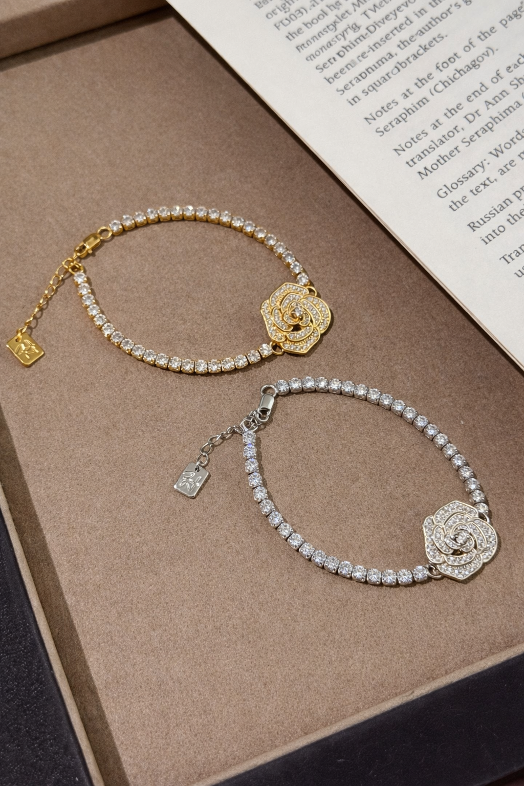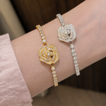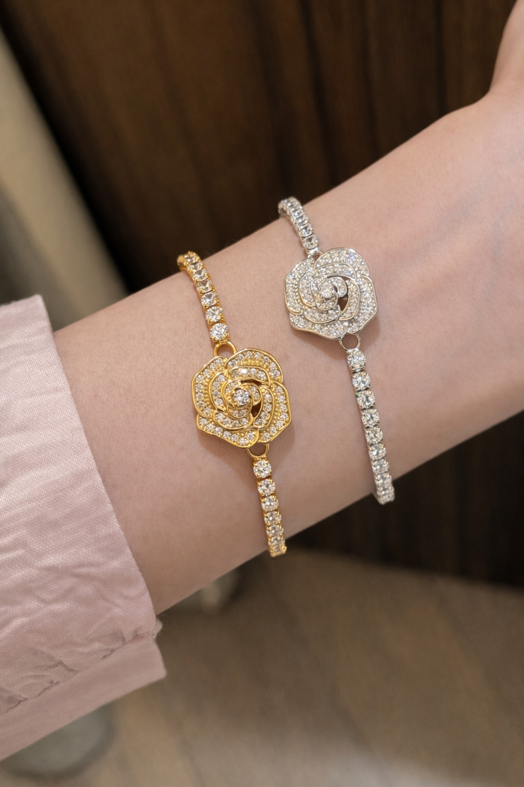 This piece is designed to feel luxurious yet wearable. Its refined tennis-style silhouette wraps smoothly around the wrist, while the floral motif adds a soft, feminine statement without overpowering your look. Whether worn alone or stacked, it brings a touch of luminous charm to both daywear and evening elegance.