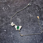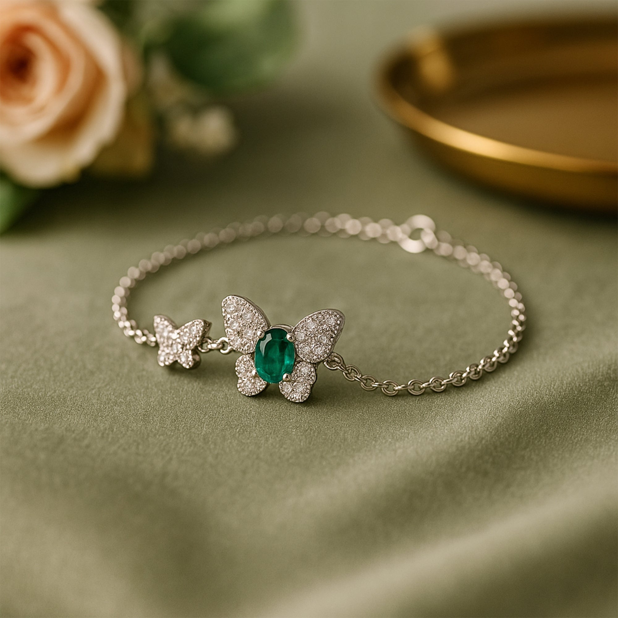 The Emerald Flutter Bracelet from AG Collective Jewelry is a graceful tribute to transformation, freedom, and inner elegance. Designed with two delicately sculpted butterflies, this bracelet captures a moment of motion and lightness. At the center, a radiant green gemstone glows from within the wings of the main butterfly, evoking renewal and the energy of growth.