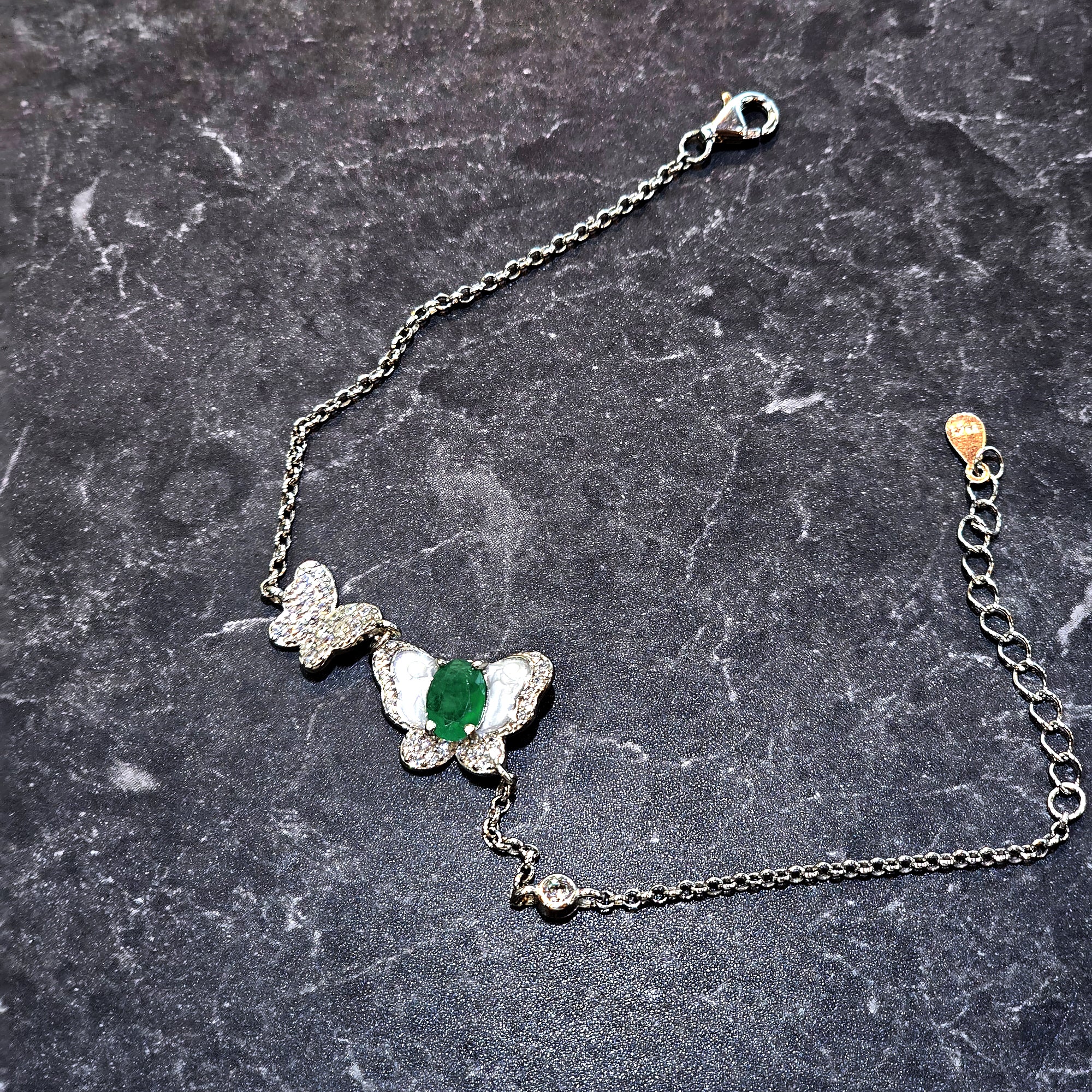 Surrounding the central emerald-like stone is a soft shimmer of pavé-set crystals that dance with every movement. The second butterfly, slightly smaller, adds a sense of balance and harmony — like a companion on a shared journey. All set in polished silver with a fine chain and adjustable clasp for comfort and flexibility.