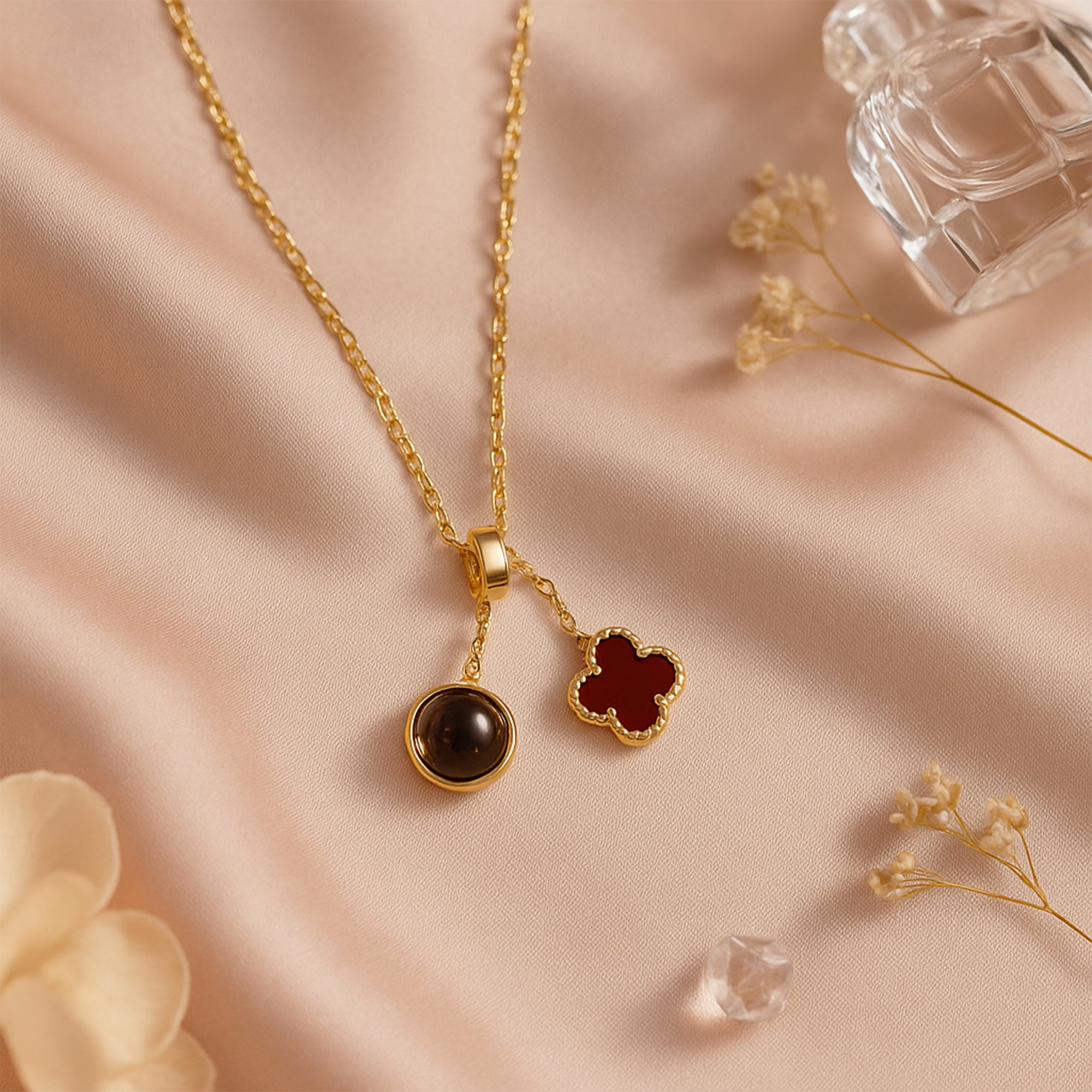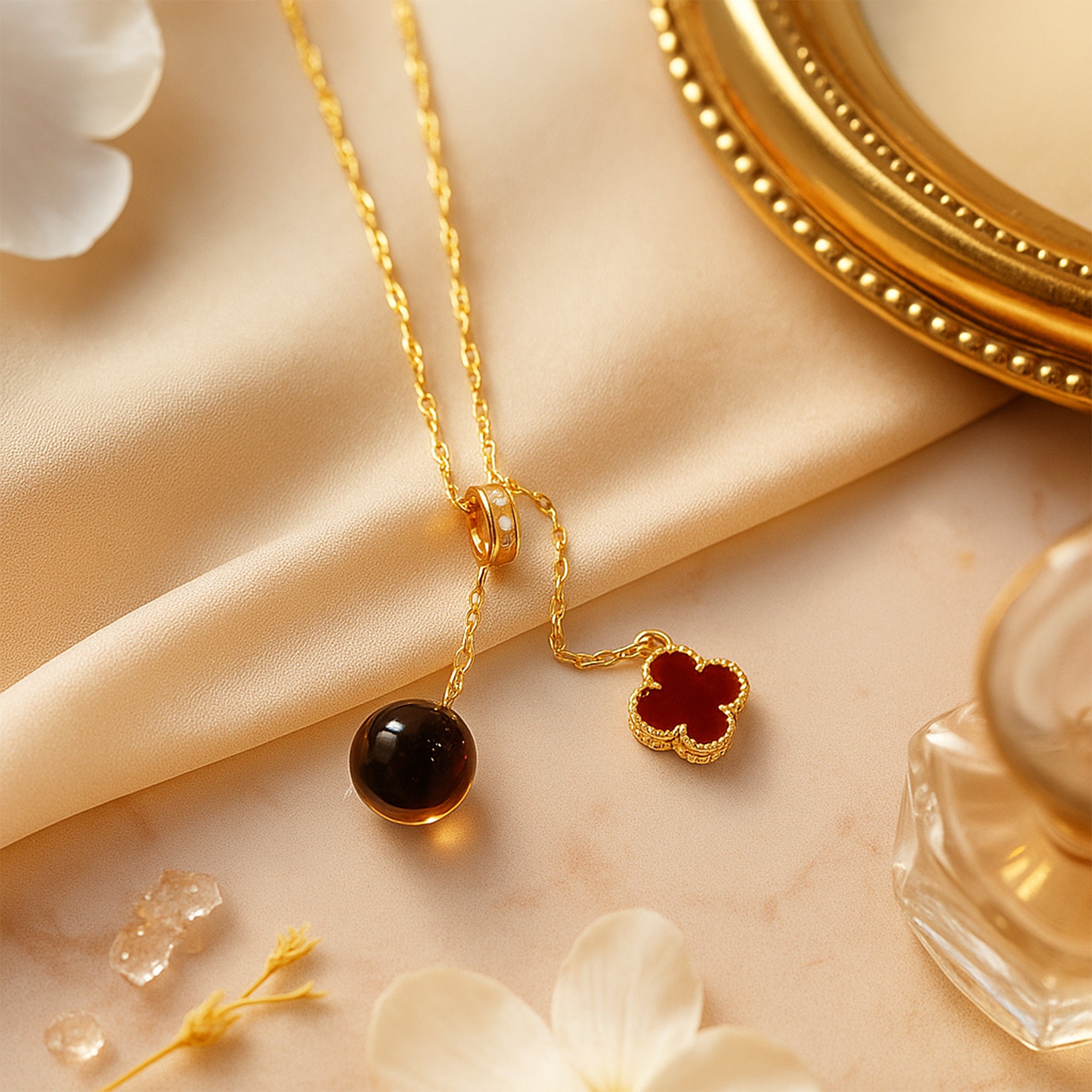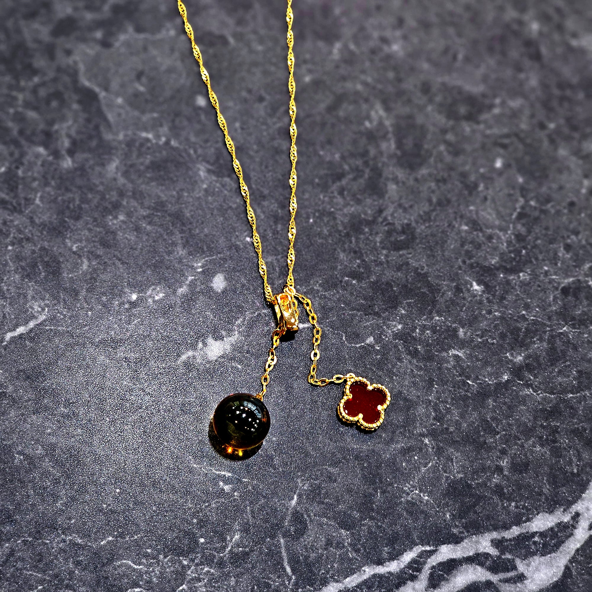 The first charm, a lustrous orb of translucent golden stone, evokes lightness, abundance, and inner clarity. The second, a rich crimson clover bordered in textured gold, brings grounding energy and the timeless symbolism of good fortune and protection.