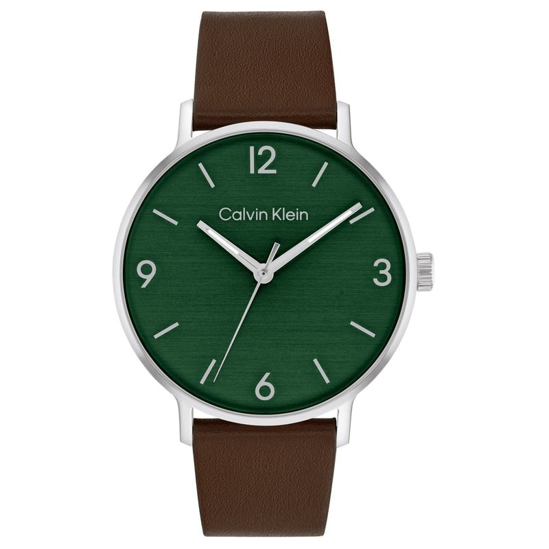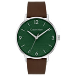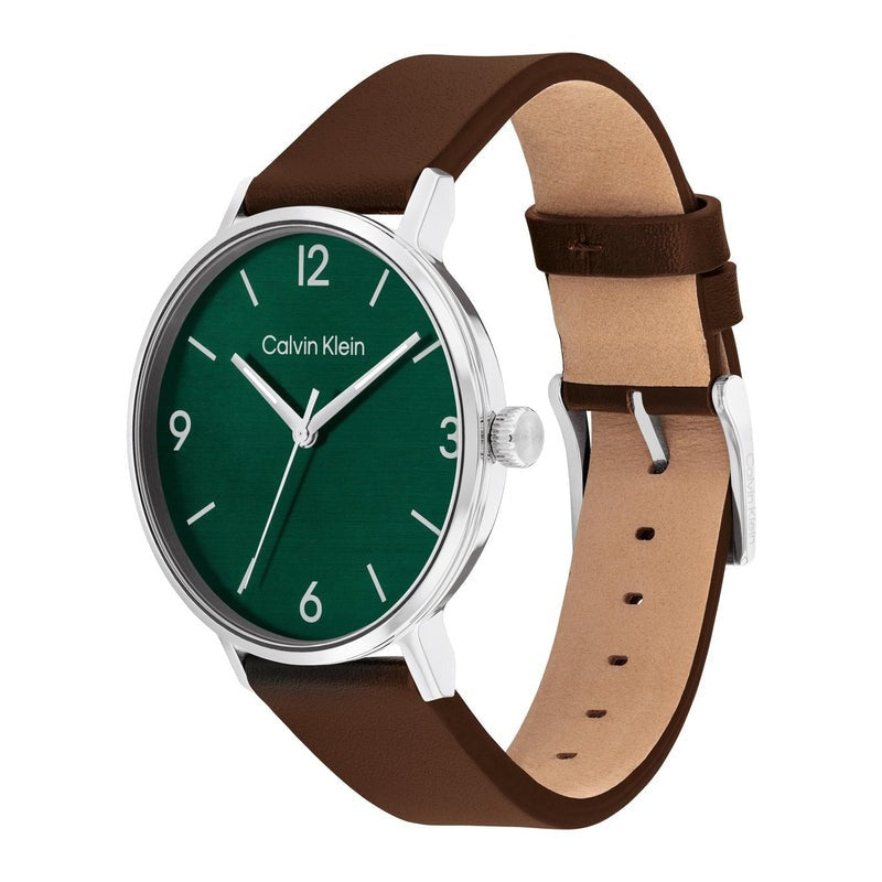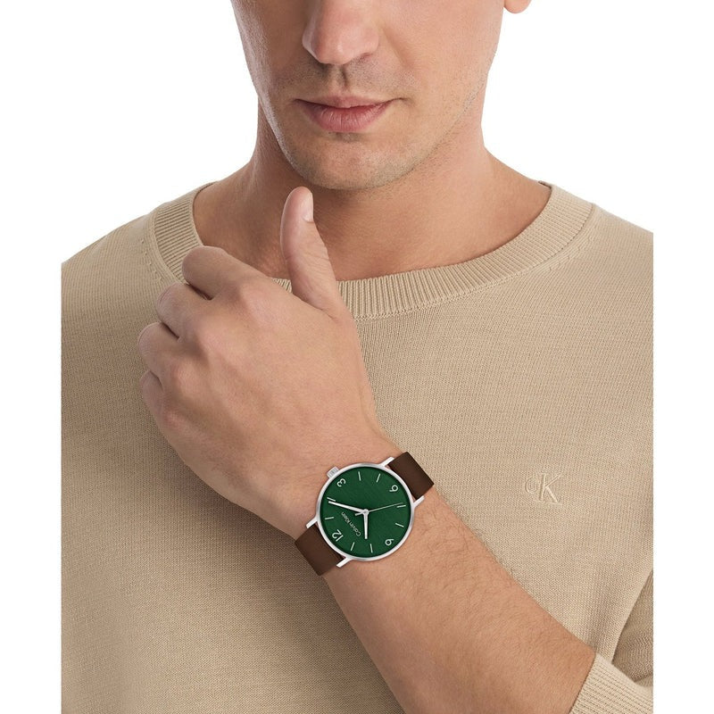 The Calvin Klein Modern Green Dial Leather Men's Watch (Model CK-25200435) offers a stylish and sophisticated design with a brown leather strap and a vibrant green dial. It features a durable stainless steel case and a stationary bezel.