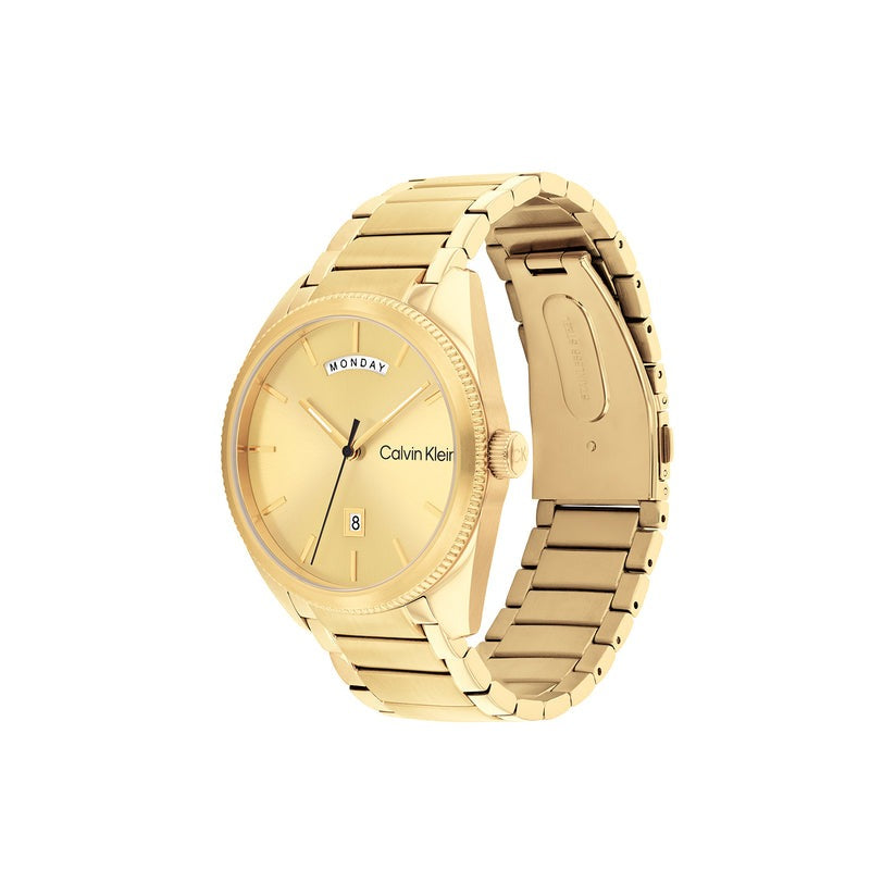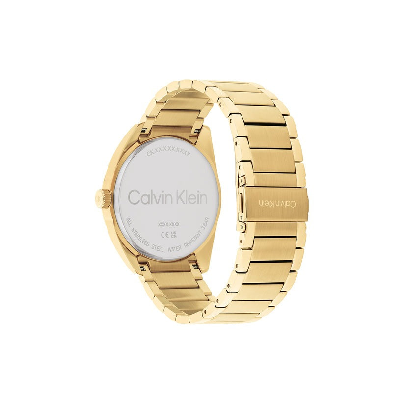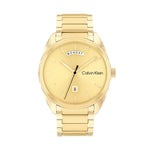 The Calvin Klein Progress Gold Plated Steel Watch (25200447) is a stylish and contemporary timepiece for men, featuring a lustrous ionic-plated gold case and strap. The 42mm round case houses a sophisticated gold dial, protected by durable mineral glass. Powered by reliable quartz movement, this watch offers precise timekeeping. With a water resistance of 3 ATM, it's designed to withstand everyday splashes and rain. This watch seamlessly blends elegance with practicality, making it an excellent accessory for both casual and formal occasions.