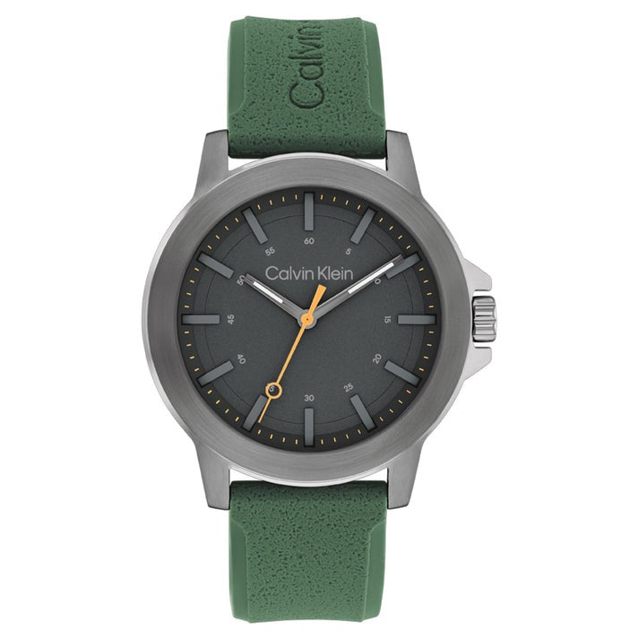 The Calvin Klein CK Reset Green Silicone Strap Analog Watch CK-25200472 is a perfect fusion of modern design and reliable functionality. Featuring a sleek grey dial encased in stainless steel, this timepiece is complemented by a vibrant green silicone strap for a bold yet comfortable style. Powered by precise quartz movement, the watch is water-resistant up to 3 ATM, making it ideal for everyday wear. Its durable mineral glass and secure buckle closure ensure lasting quality and convenience.