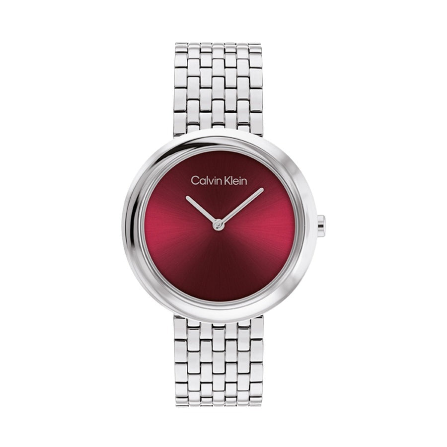 The Calvin Klein Twisted Bezel Red Dial Watch (Model 25100064) is a stunning women's timepiece with a unique twisted bezel design. Combining Japanese craftsmanship with a bold red dial, this stainless steel watch offers both elegance and durability.