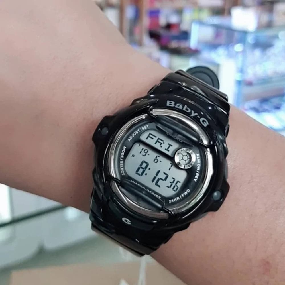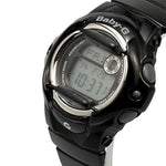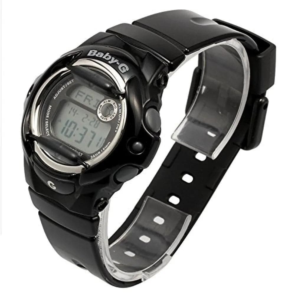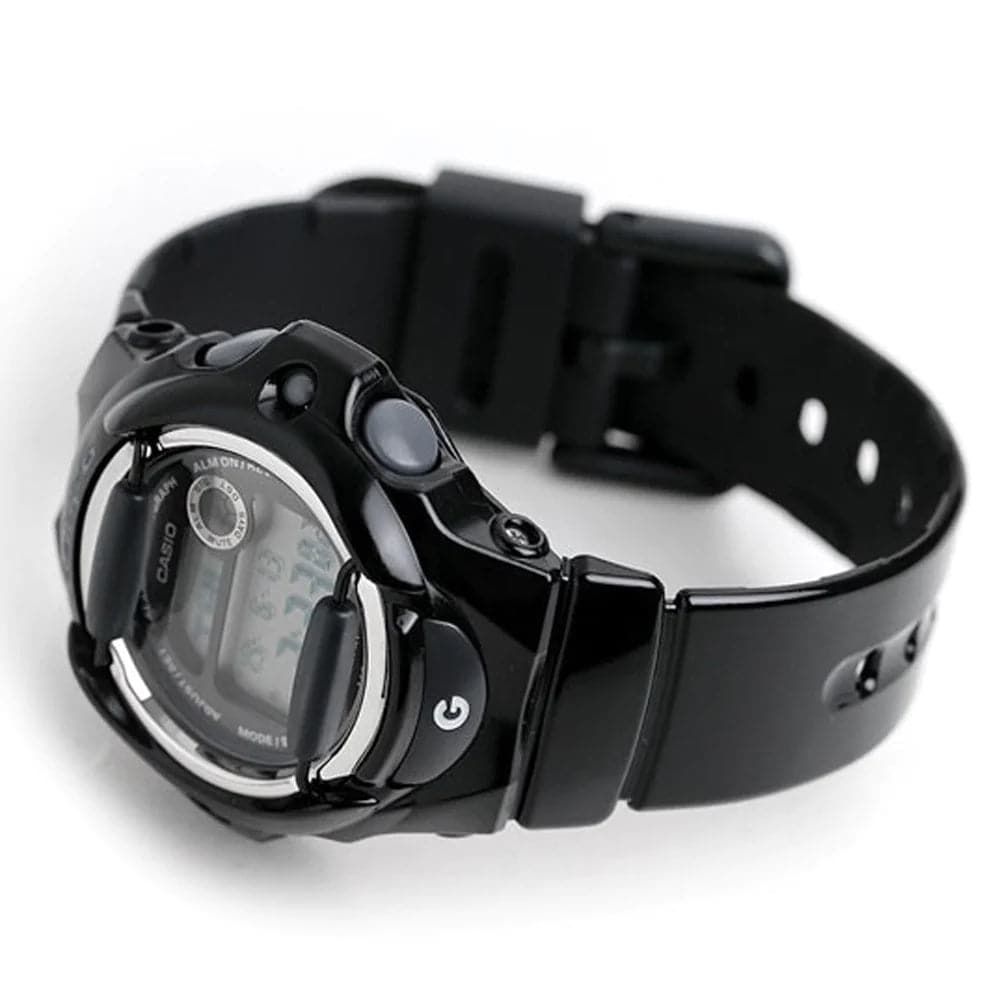 Baby-G introduces a whole new color palette of glossy solids into the line-up. With vivid colors, metallic dials and matching LCDs, these new colors are sure to make a splash. Black resin band digital watch with a neutral face.