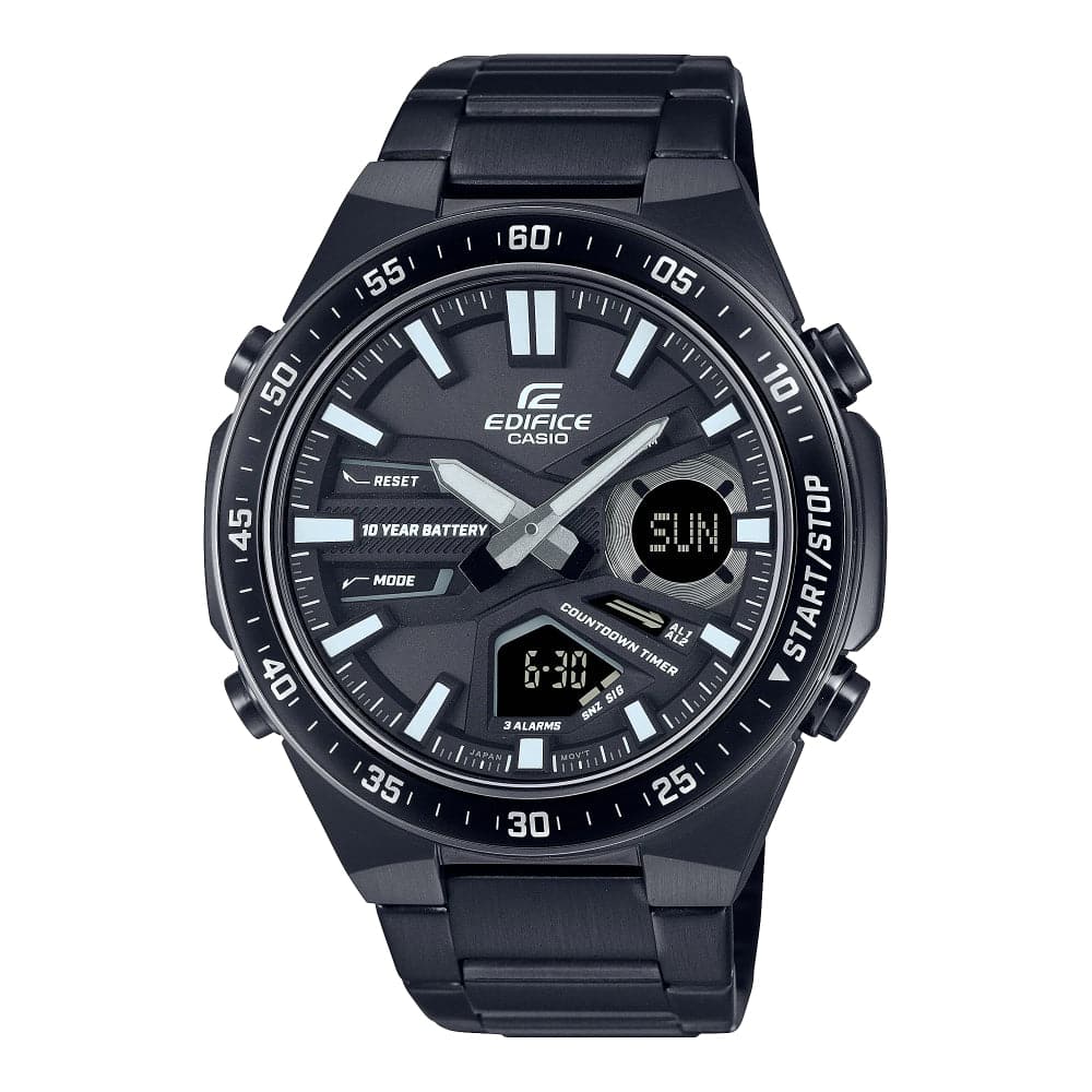 The face design offers enhanced depth and dimensionality for a dynamic, sporty look. Digital inset dials deliver a variety of functions, including world time, 1/100 second stopwatch, and countdown timer. Strike just the right chord with a mid-sized classic EDIFICE chronograph.