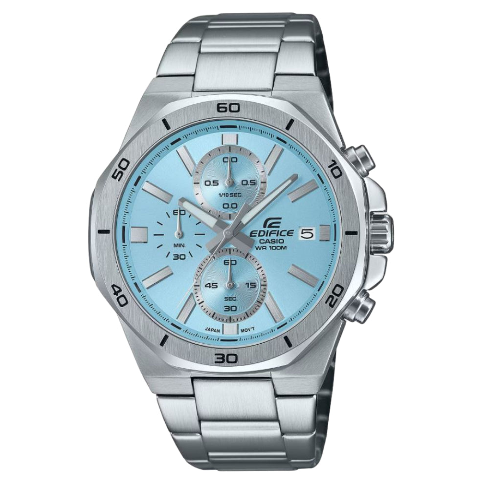 The flat front surface of the octagonal bezel is polished to a hairline finish and paired with mirror-finish sides, creating a handsome textural contrast — all dressed up with a dial in a soft, yet vibrant color to give your wrist a touch of extra style.