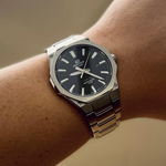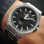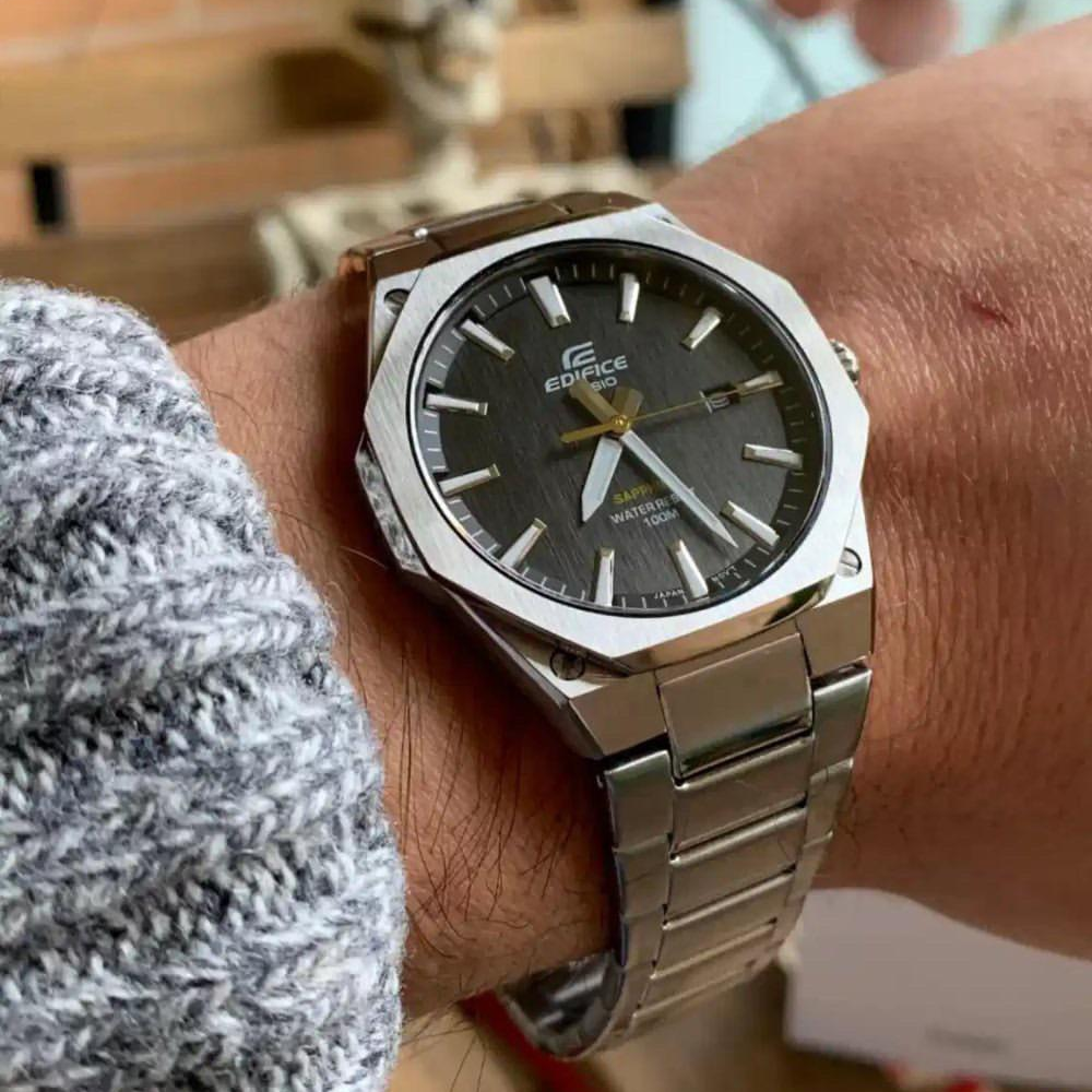 EDIFICE SLIM series with Sapphire Crystal | This three-hand analog model features a slim 7.8 mm thick case that enhances fit. The watch boasts a flat octagonal bezel with a hairline finish that creates a sporty yet luxurious design. A dial with a hairline finish also creates a high quality feel. Screws at the four corners of the case, a powerful index design, and a gold second hand create a sporty finish. Uses a scratch-resistant sapphire crystal.