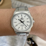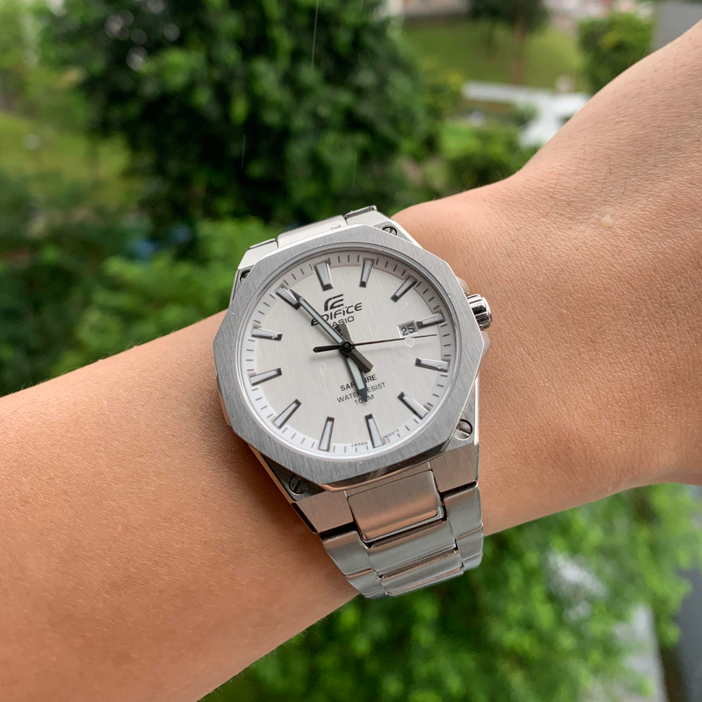 EDIFICE SLIM series with Sapphire Crystal | This three-hand analog model features a slim 7.8 mm thick case that enhances fit. The watch boasts a flat octagonal bezel with a hairline finish that creates a sporty yet luxurious design. A dial with a hairline finish also creates a high quality feel. Screws at the four corners of the case, a powerful index design, and a gold second hand create a sporty finish. Uses a scratch-resistant sapphire crystal.