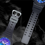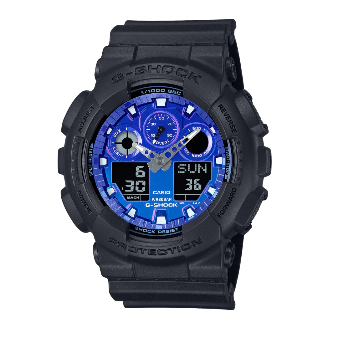 A bold and striking timepiece, the Casio G-SHOCK GA-100FL-1ADR ignites your wrist with flames of intense blue and a smoky gradient design. Built for adventure and durability, this watch features shock resistance, magnetic resistance, and 200m water resistance, making it a perfect companion for extreme conditions.