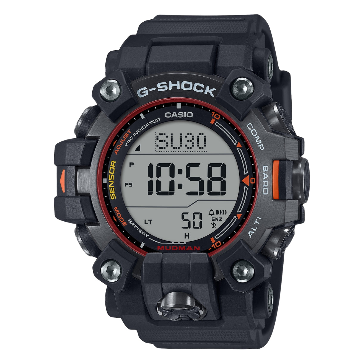 Whatever you’re doing, wherever you are — the G-SHOCK Master of G line has your back. Based on GRAVITYMASTER, MUDMASTER, and MUDMAN models that deliver peak performance in punishing conditions in the air and on land, this line features a black watch case symbolizing toughness, with accents in vivid emergency colors that capture the world of professionals involved in rescue efforts and other critical missions. The MUDMAN GW-9500MEC not only features a dust, mud, and shock-resistant structure, but also delivers radio-controlled, solar-powered functionality. The digital compass display with improved readability employs a duplex LCD for greater practical utility. Stainless steel for the bezel components and black ion plating complete the watch’s intrepid look.