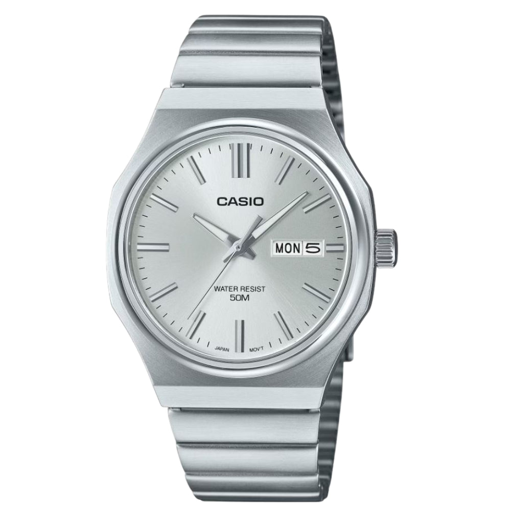 Go for bold, streamlined style with a classic, easy-read analog watch featuring a metal octagonal case.