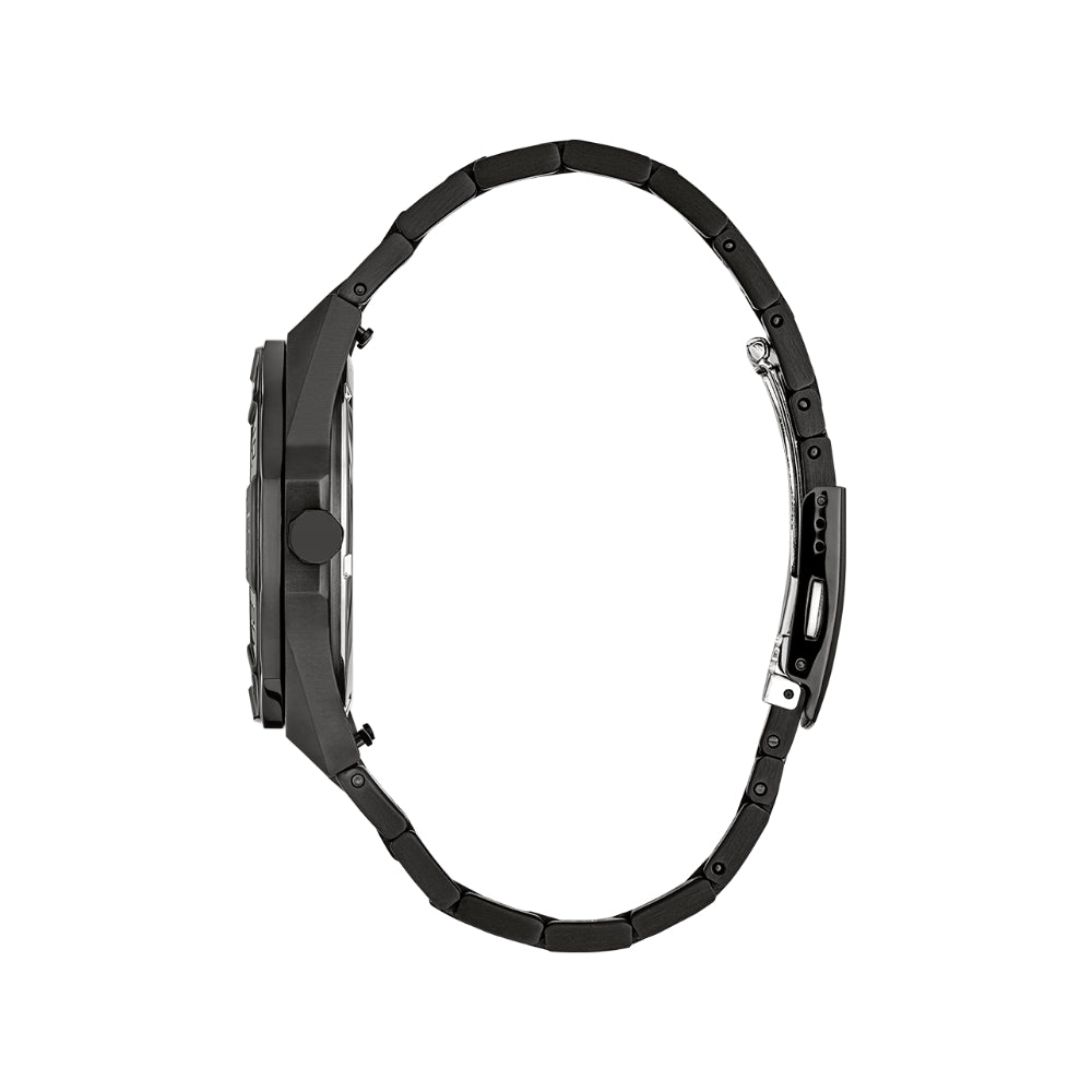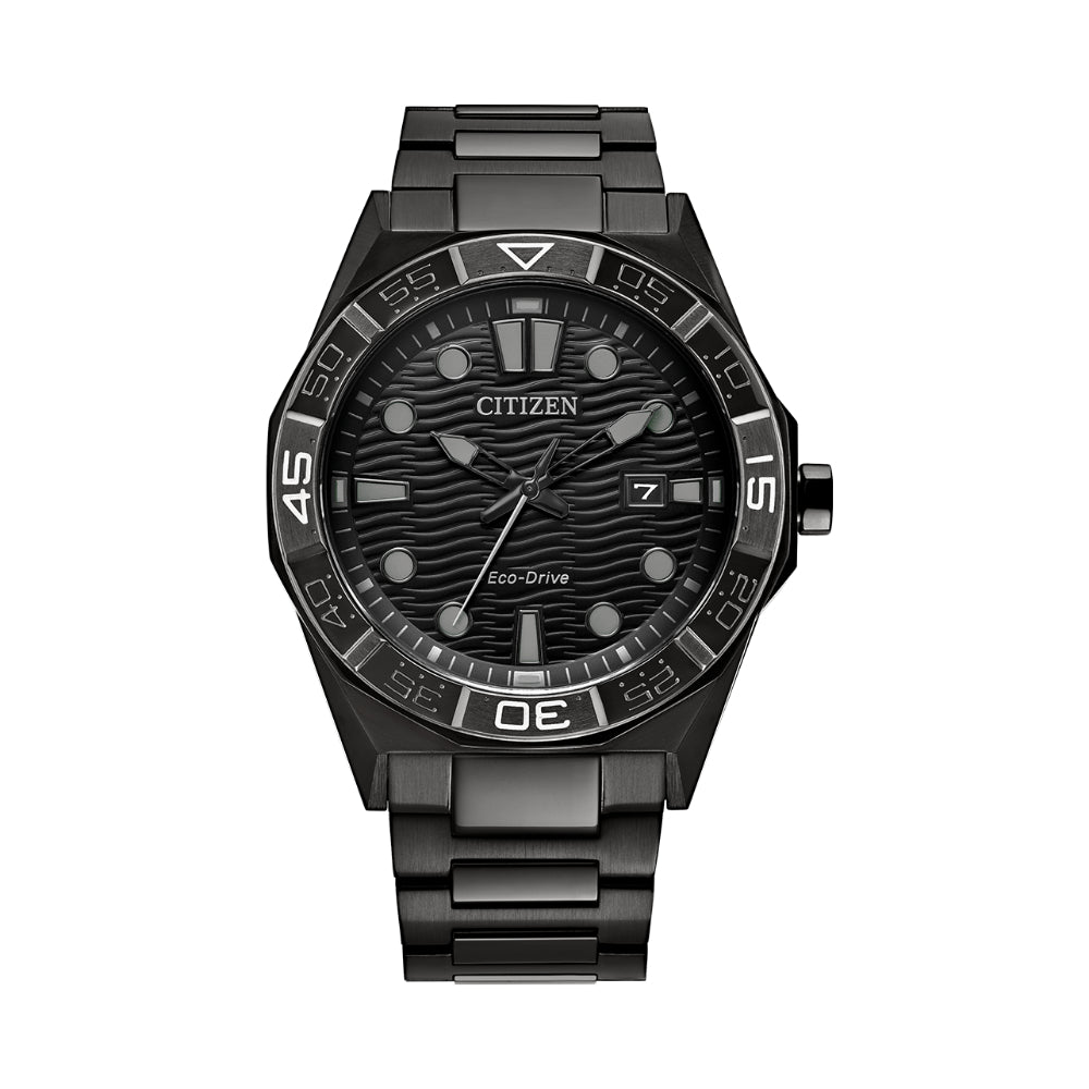 Be bold in monochrome with the latest Sport Casual timepiece. Crafted in black ion-plated stainless steel and built to perform at 42mm, this watch is water resistant up to 100 meters and made for everyday durability. Its dark, modern aesthetic is matched by sharply angled facets across the case, crown, and bidirectional friction bezel. The dial keeps it clean and confident with simple time and date functions, letting the monochromatic styling take the spotlight at every glance. Powered by Citizen’s Eco-Drive technology – it runs on light, any light, and never needs a battery. Calibre J810.