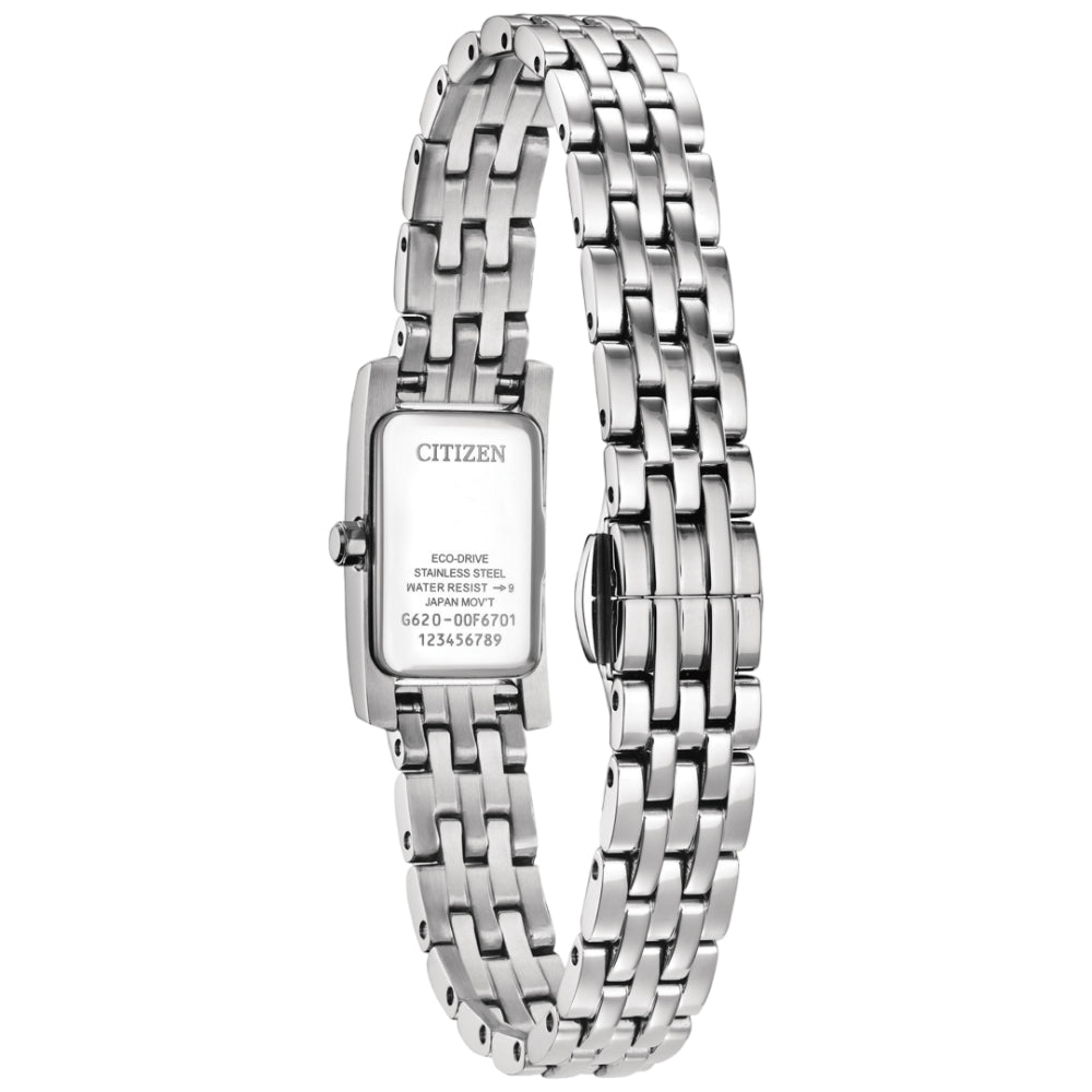 Inspired by the elegant, elongated shape of the original, the Petite Palidoro reissue is the latest women’s watch in Citizen's collection and perfect for elegant wear. Measuring 28mm in stainless steel, with its rectangular form accented by crystals on either side of the bezel and a geometric crown. A matching five-link bracelet effortlessly secures the watch to the wrist. The pink mother-of-pearl dial is adorned with stylized indices in blue adding to its elegant aesthetic. Sustainably powered by any light with our proprietary Eco-Drive technology that never needs a battery, this ladies’ watch is the perfect addition to any look.