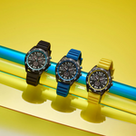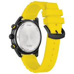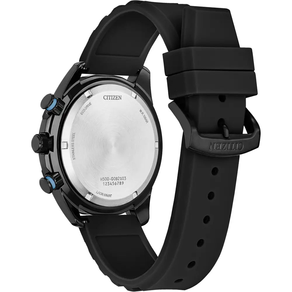 Bold and sporty, this new Brycen chronograph from Citizen is ready for any adventure. The watch wears boldly at 44.8mm, with a black-tone stainless steel case accented with blue details on its racing-style pushers. A rotating 60-minute bezel adds to its functionality, while a durable black silicone strap secures the timepiece to the wrist.
