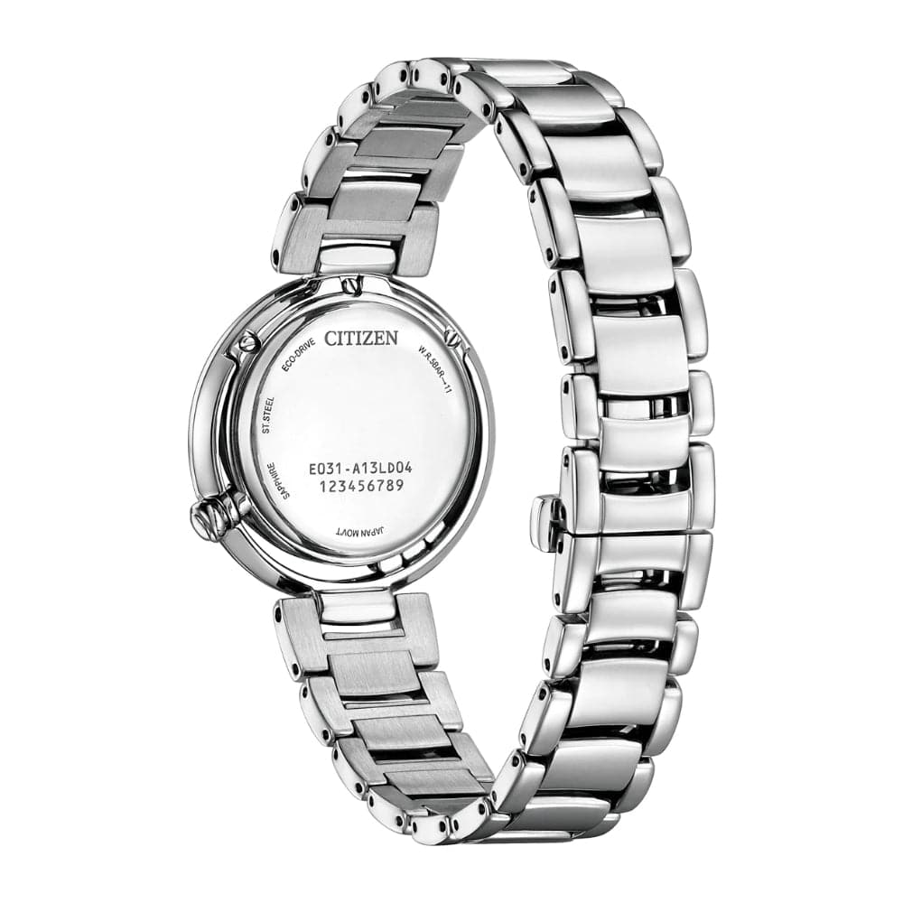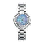 Classic lines and hints of romance make this newest piece to our women’s collection, the Citizen L Arcly, a captivating addition of sustainable luxury. With a design inspired by the original Citizen "Sunrise," the distinctive stainless-steel timepiece is a charming accent on the wrist that's perfect for glamorous wear. Sleek lines define the watch's 29.8mm silhouette, with a subtle 4 o'clock crown and 7 o'clock diamond accent adding to its entrancingly delicate look. On its blue-tinged mother-of-pearl dial, applied diamond markers and sharp hands indicate the time in style atop a subtle flower motif, keeping the attention on the pure aestheticism of the timepiece. Sustainably powered by any light with our proprietary Eco-Drive technology that never needs a battery, this elegant ladies’ watch is the perfect addition to elevate any outfit. Water resistant to 50 meters.