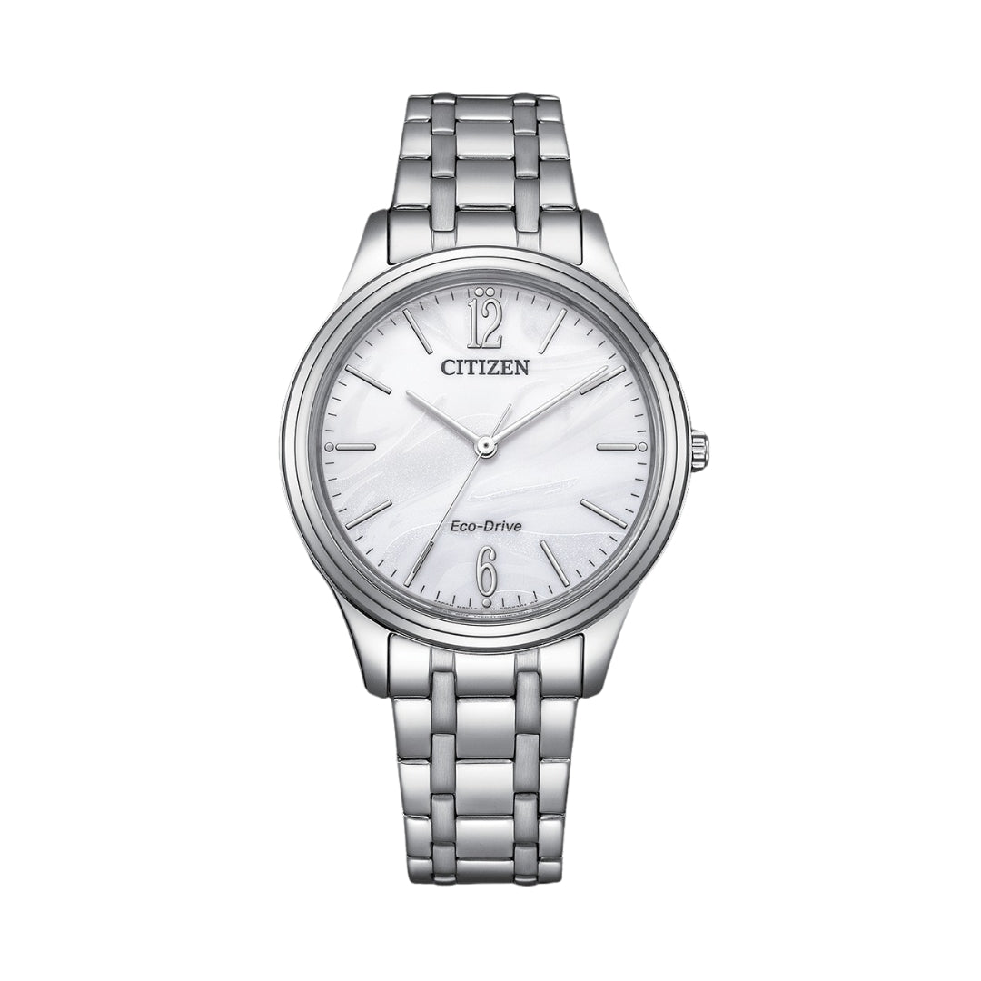 The Citizen EM0411-71A is a refined timepiece designed for elegance and everyday wear. With its sleek white dial, stainless steel case and strap, and Eco-Drive technology, this watch is powered by light, eliminating the need for battery replacements. It boasts a slim 7.3mm case thickness, 5-bar water resistance, and a durable crystal glass for added protection.