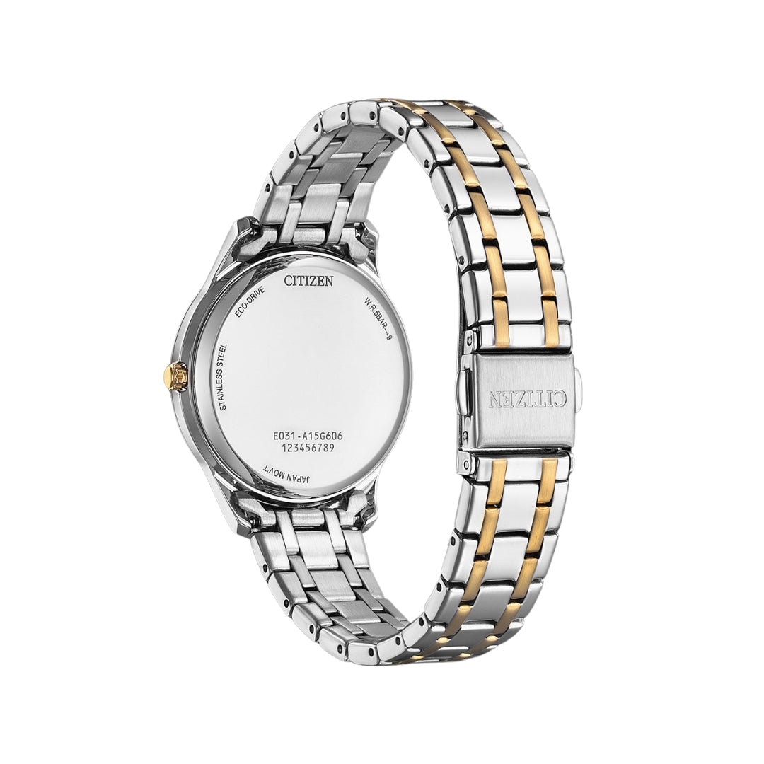 The Citizen EM0416-78A embodies timeless elegance with its white pearl dial and two-tone stainless steel case featuring a luxurious rose gold finish. Powered by Eco-Drive technology, this watch never needs a battery replacement, charging effortlessly with any light source. Its slim 7.3mm profile, 50m water resistance, and durable crystal glass make it a perfect blend of style and practicality for everyday wear.