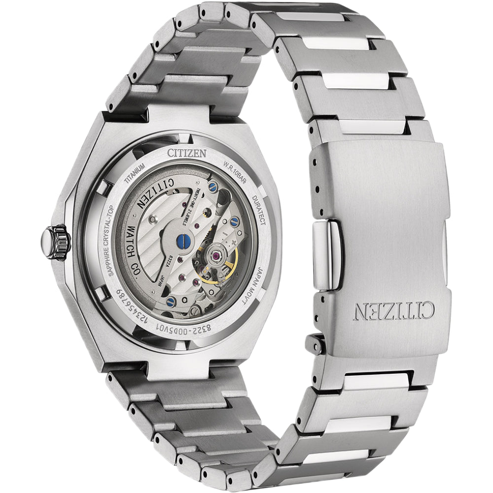 The Citizen Zenshin 60 NK5020-58L is a refined automatic timepiece crafted entirely from lightweight and durable Super Titanium™, enhanced with scratch-resistant Duratect coating. It features a 40.5mm case and is powered by Citizen’s in-house Caliber 8322 movement, offering a 60-hour power reserve, stop-seconds function, and daily accuracy of –20 to +40 seconds. The watch showcases a striking dégradé light blue dial with a small seconds subdial positioned between 4 and 5 o’clock, protected by sapphire crystal and complemented by an exhibition caseback. With 100-meter water resistance and a Super Titanium™ bracelet, the NK5020-58L blends mechanical precision, modern elegance, and everyday comfort.
