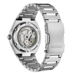 The Citizen Zenshin 60 NK5020-58P is a refined automatic timepiece that blends modern design with mechanical sophistication. It features a 40.5mm Super Titanium™ case and bracelet, treated with scratch-resistant Duratect coating to ensure both durability and lightweight comfort. At its heart is Citizen’s in-house Caliber 8322 movement, delivering a 60-hour power reserve, hacking seconds, and a daily accuracy of –20 to +40 seconds. The gold-toned dégradé dial offers a subtle yet striking aesthetic, highlighted by a small seconds subdial at 4:30 and protected by sapphire crystal. An exhibition caseback reveals the mechanical beauty within, while the 12-sided brushed bezel and 100-meter water resistance round out this elegant yet robust timepiece.
