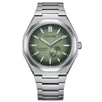 The Citizen Zenshin 60 NK5020-58X is a sophisticated automatic watch that exemplifies innovation and elegance. Housed in a 40.5mm Super Titanium™ case and bracelet with a scratch-resistant Duratect coating, it offers exceptional durability and a lightweight wearing experience. Powered by the in-house Caliber 8322 movement, it provides a 60-hour power reserve, hacking seconds, and a daily accuracy of –20 to +40 seconds. The standout feature is its gradient green dégradé dial, which brings a contemporary depth to the design, accented by a small seconds subdial at 4:30 and safeguarded by sapphire crystal. The exhibition caseback reveals the intricate mechanics, while a distinctive 12-sided bezel and 100-meter water resistance complete the refined yet resilient profile of this timepiece.