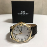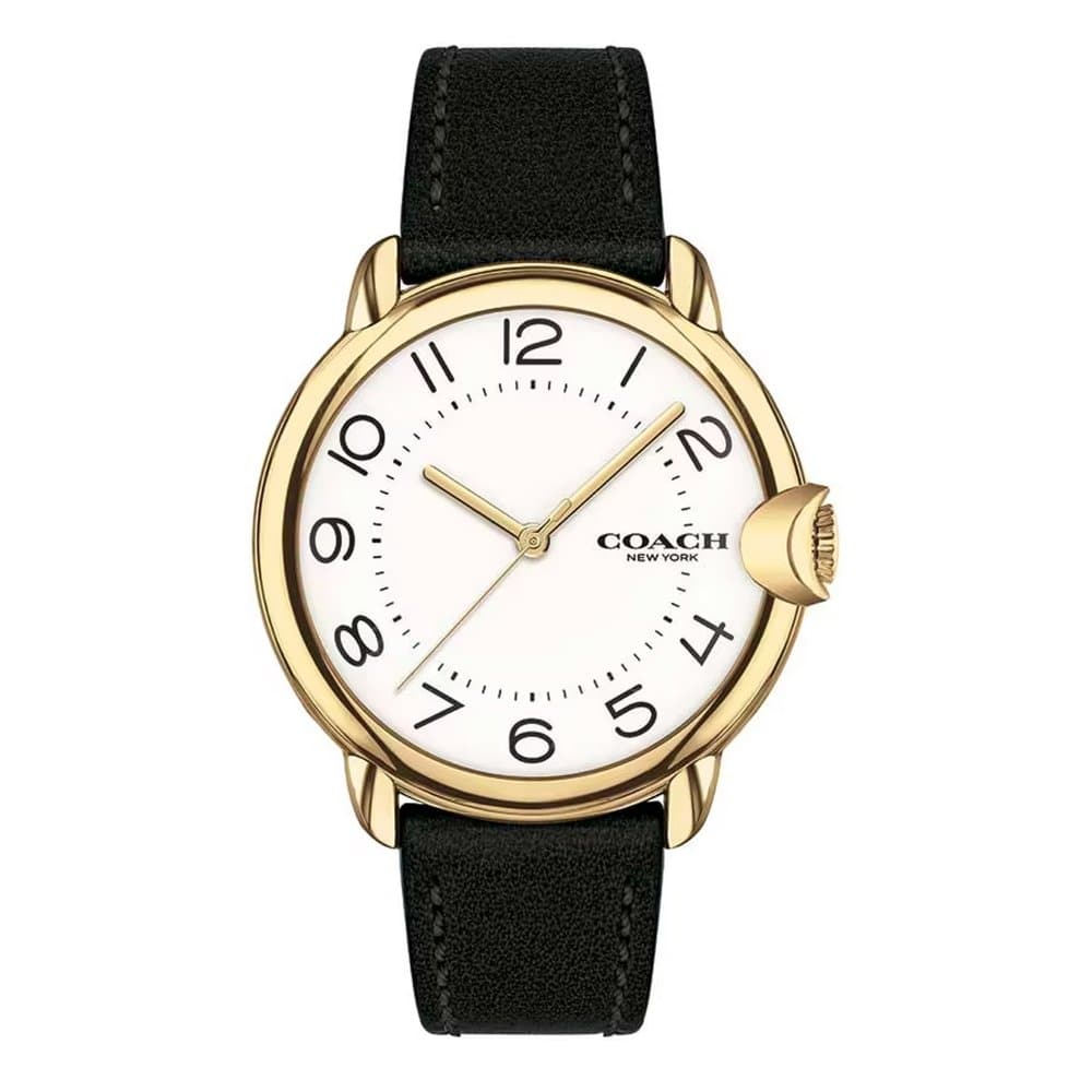 Gold-tone stainless steel case with a black leather strap. Fixed gold-tone bezel. White dial with gold-tone hands and Arabic numeral hour markers. Minute markers around an inner ring. Dial Type: Analog. Quartz movement. Scratch resistant mineral crystal. Pull / push crown. Solid case back. Round case shape. Case size: 36 mm. Case thickness: 9.3 mm. Band width: 17 mm. Tang clasp. Water resistant at 30 meters / 100 feet. Functions: hour, minute, second. Arden Series. Casual watch style.