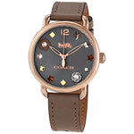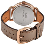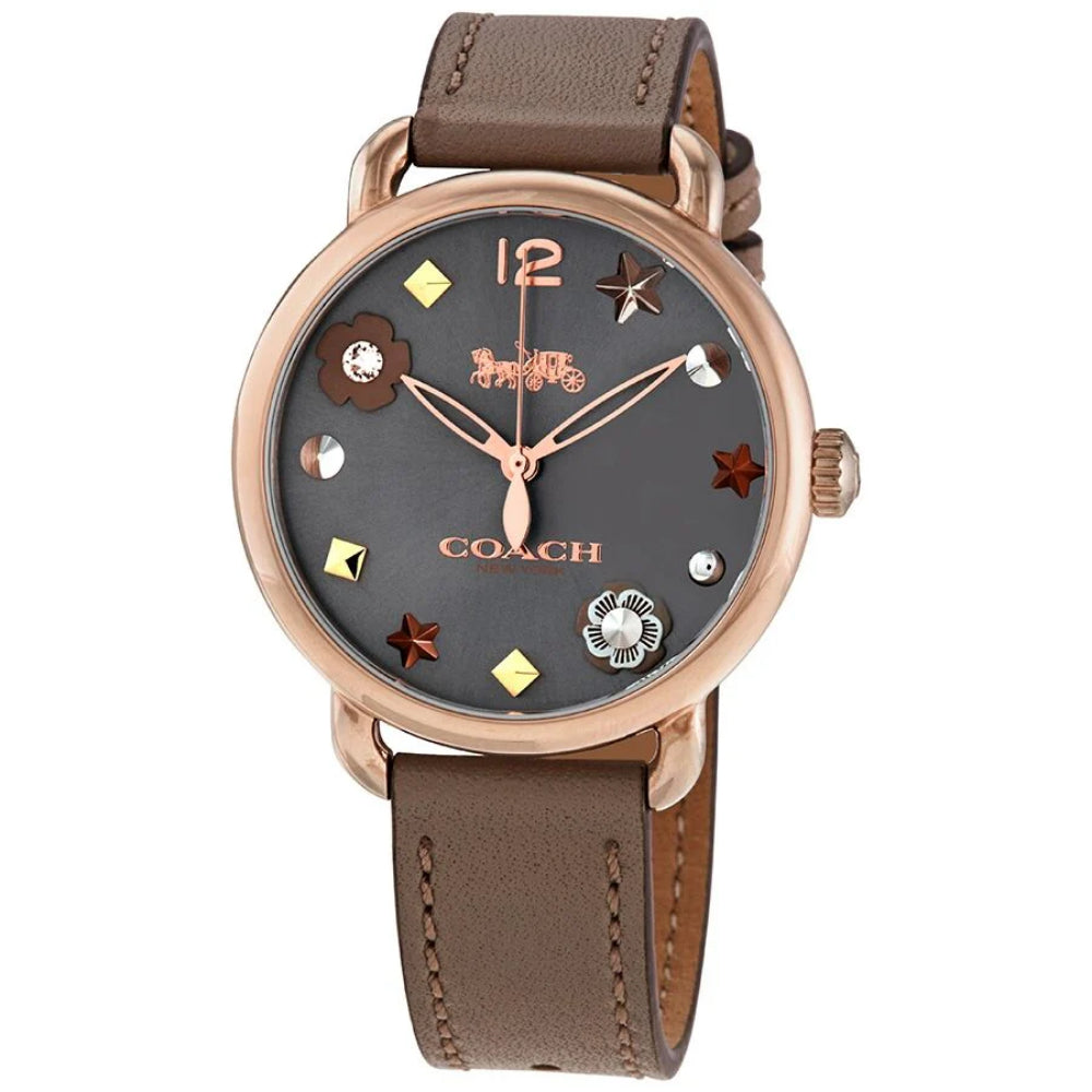 Rose gold-tone stainless steel case with a fawn leather strap. Fixed rose gold-tone bezel. Grey dial with rose gold-tone hands and studs, stars, and floral motif hour markers. An Arabic numeral appears at the 12 o'clock position. Dial Type: Analog. Quartz movement. Scratch resistant mineral crystal. Pull / push crown. Solid case back. Round case shape. Case size: 36 mm. Case thickness: 9 mm. Band width: 17 mm. Tang clasp. Water resistant at 30 meters / 100 feet. Functions: hour, minute, second. Casual watch style. Watch label: Japan Movt. Coach Delancey Quartz Grey Dial Ladies Watch 14502797P.
