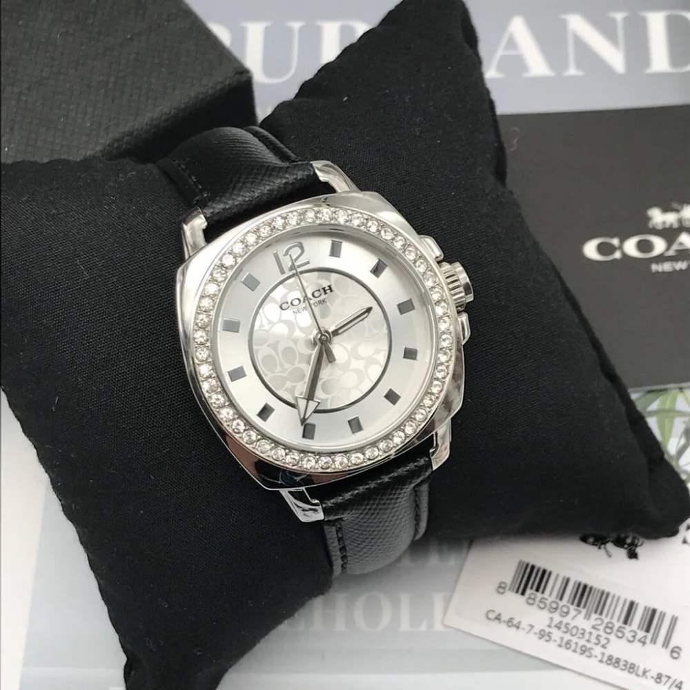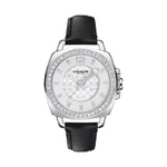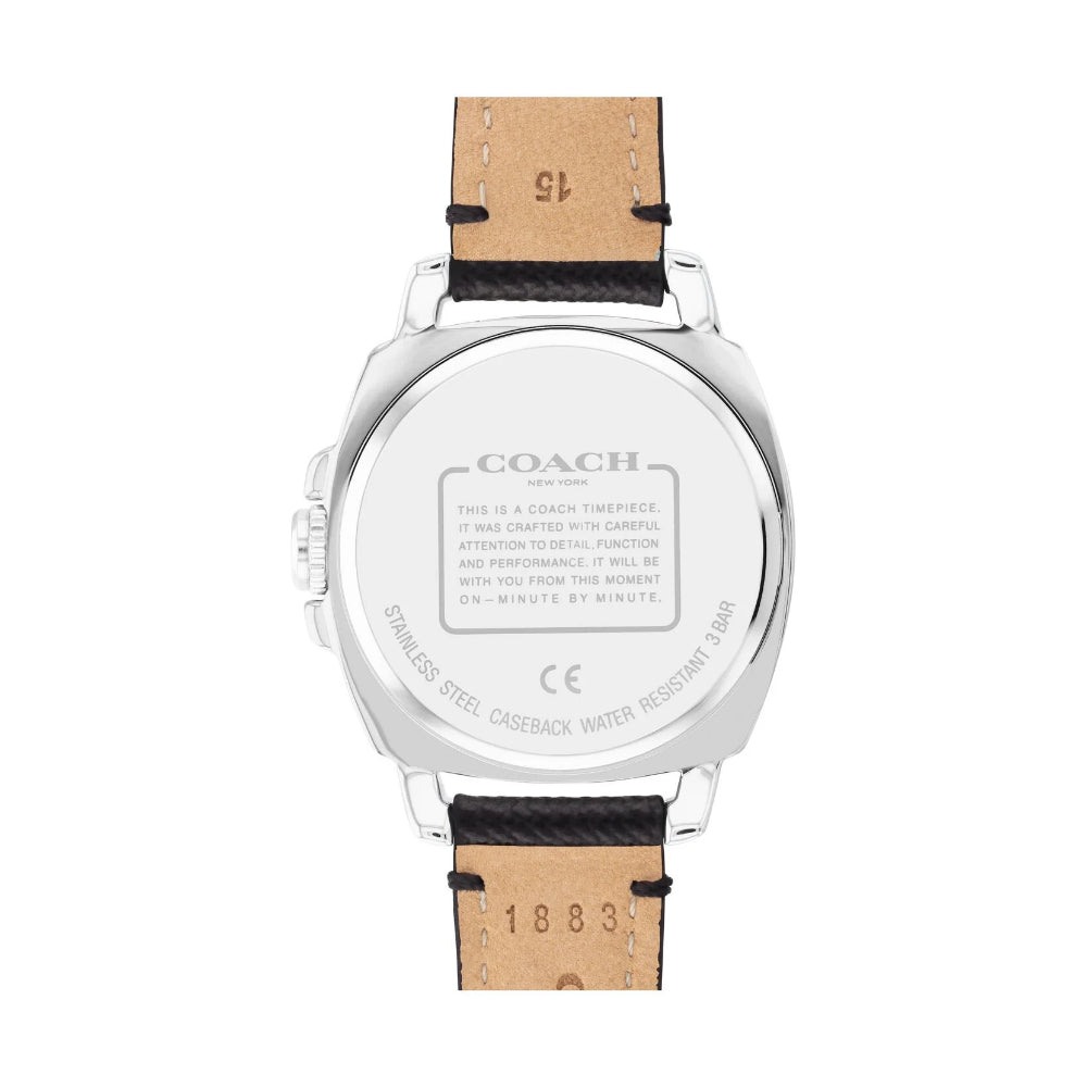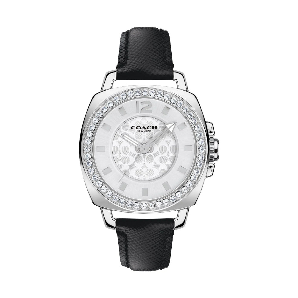 Coach Boyfriend, 34mm, stainless steel case, crystal set bezel, silver white dial and black leather strap.