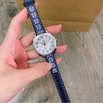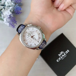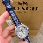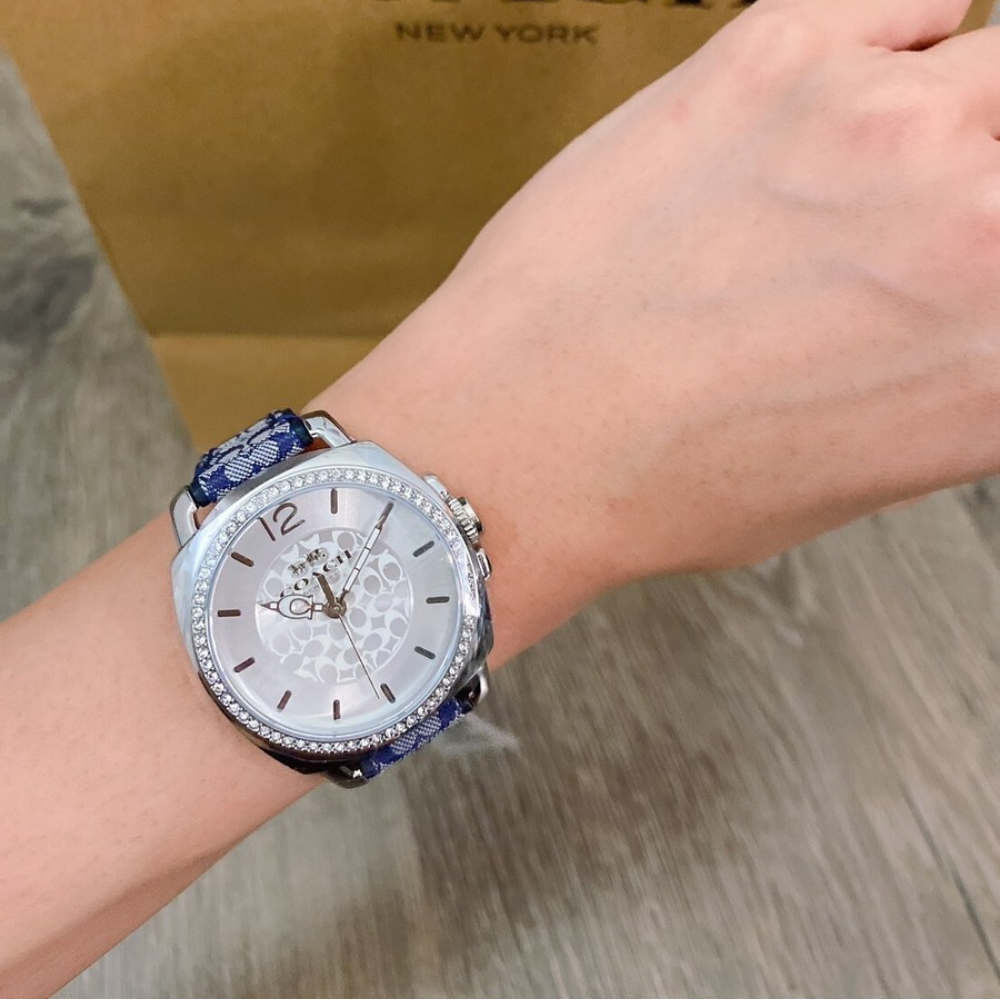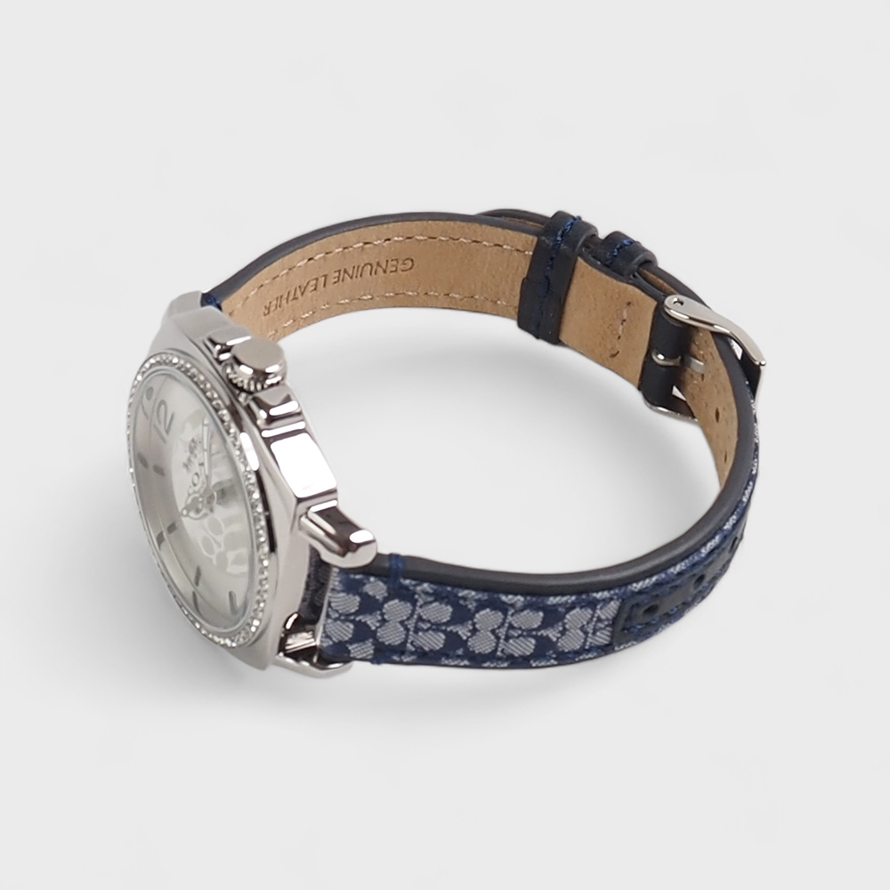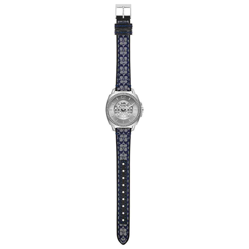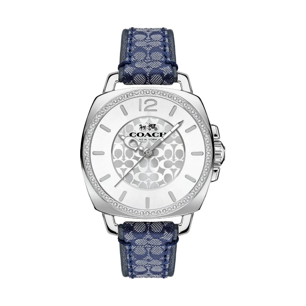 Coach Boyfriend, 34mm, stainless steel case, crystal set bezel, silver white dial and navy signature C strap.