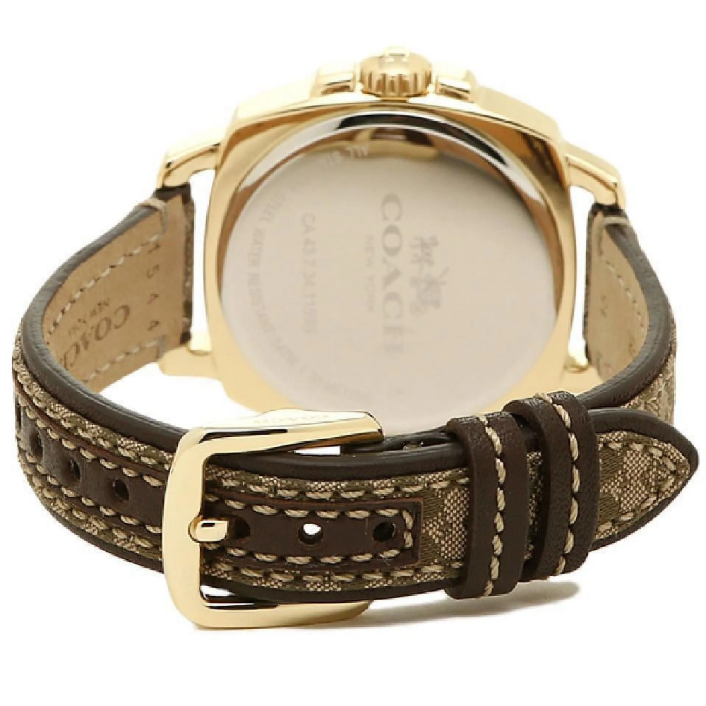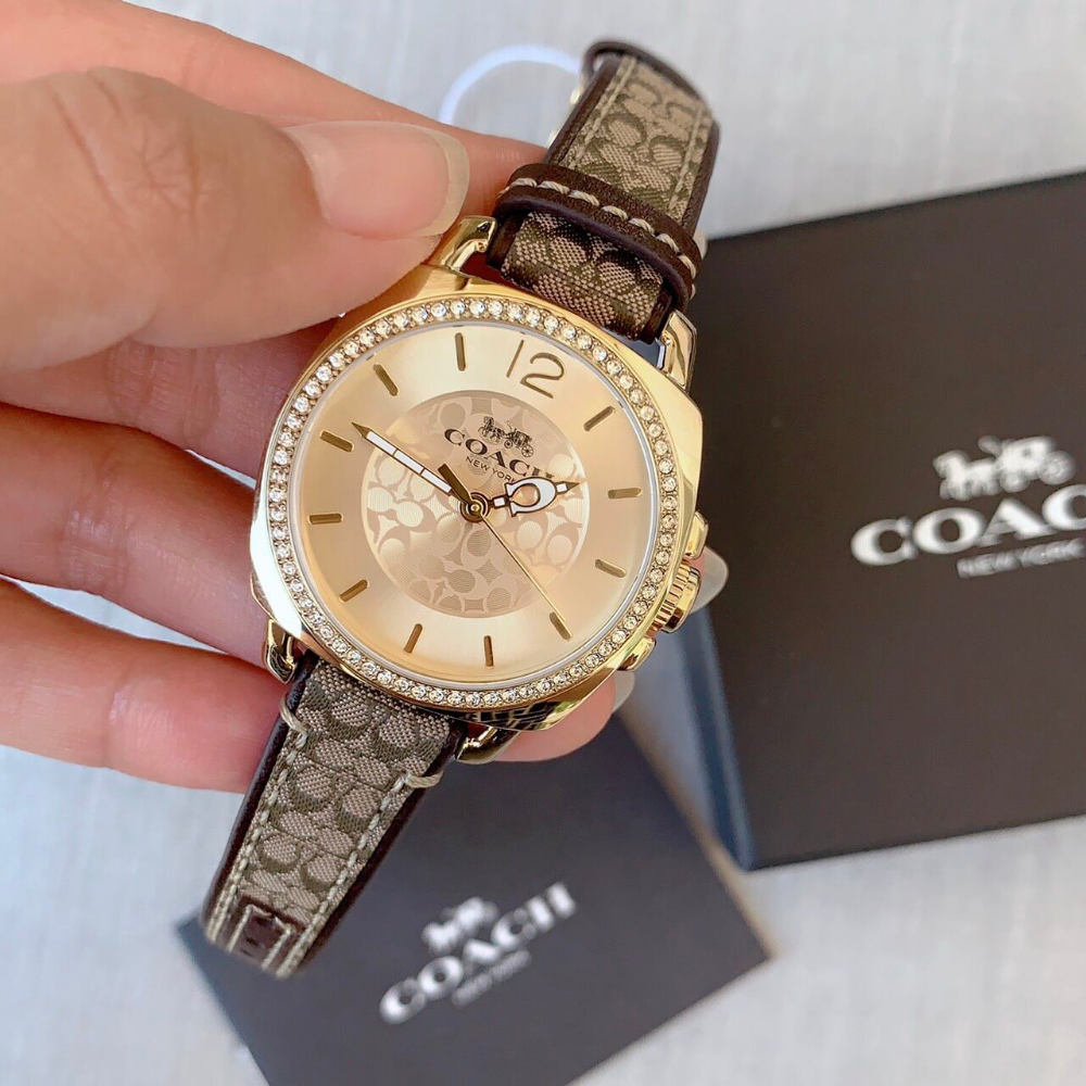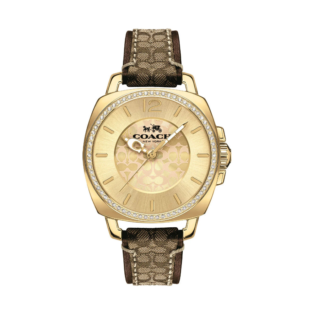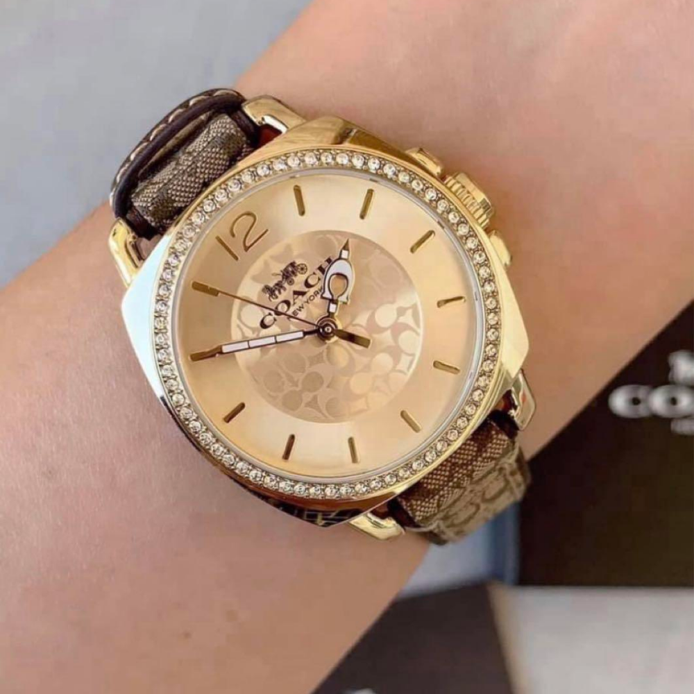 The Coach Boyfriend watch features a 34mm yellow gold-plated case, a crystal-set bezel, a stunning gold dial, and a brown signature C strap. It’s a stylish accessory that adds a touch of elegance to any outfit!